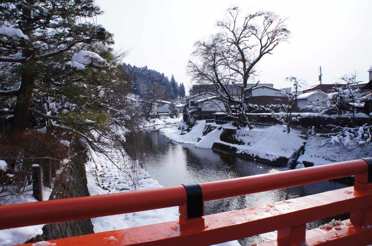 飛騨高山の有名な観光スポットである、三町の古い街並みのすぐ近くを流れている川です。冬に訪れ、行った日は天気が良かったですが、宮川沿いには白い雪がたくさん残っていて雪景色でした。また赤い橋がよく映えていました。