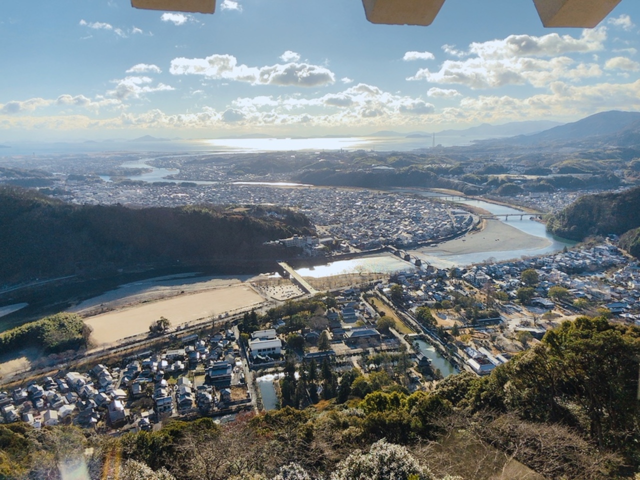 目下に錦川にかかる錦帯橋そして岩国市の街並み。