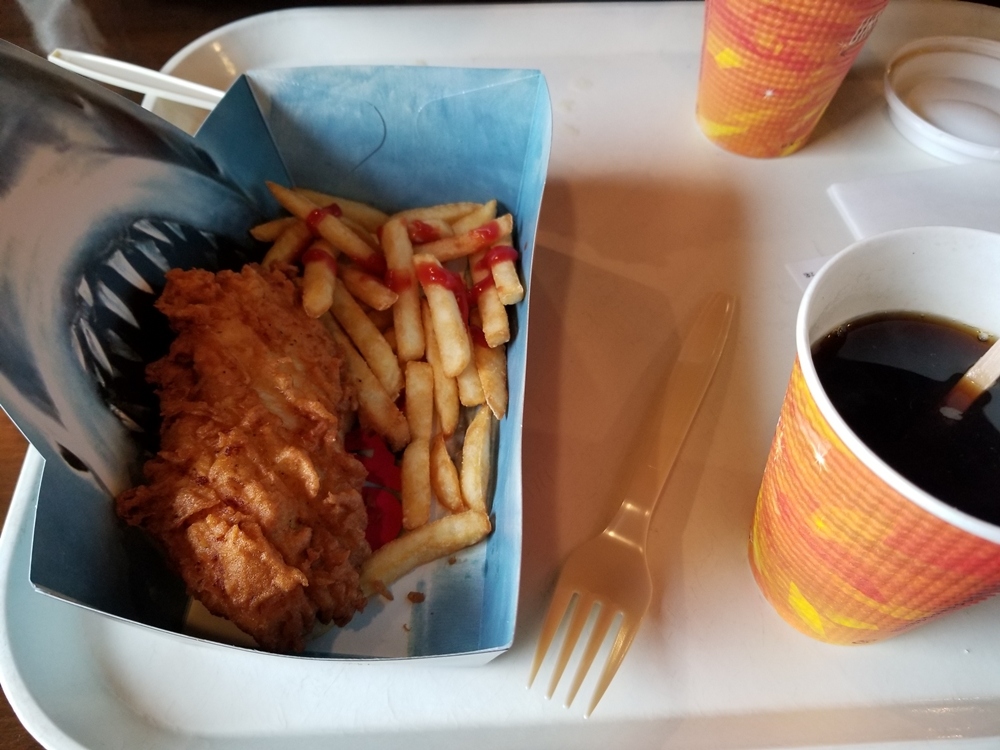 窓の外のジョーズの舞台を眺めながら、フライドチキンセットをいただきました。