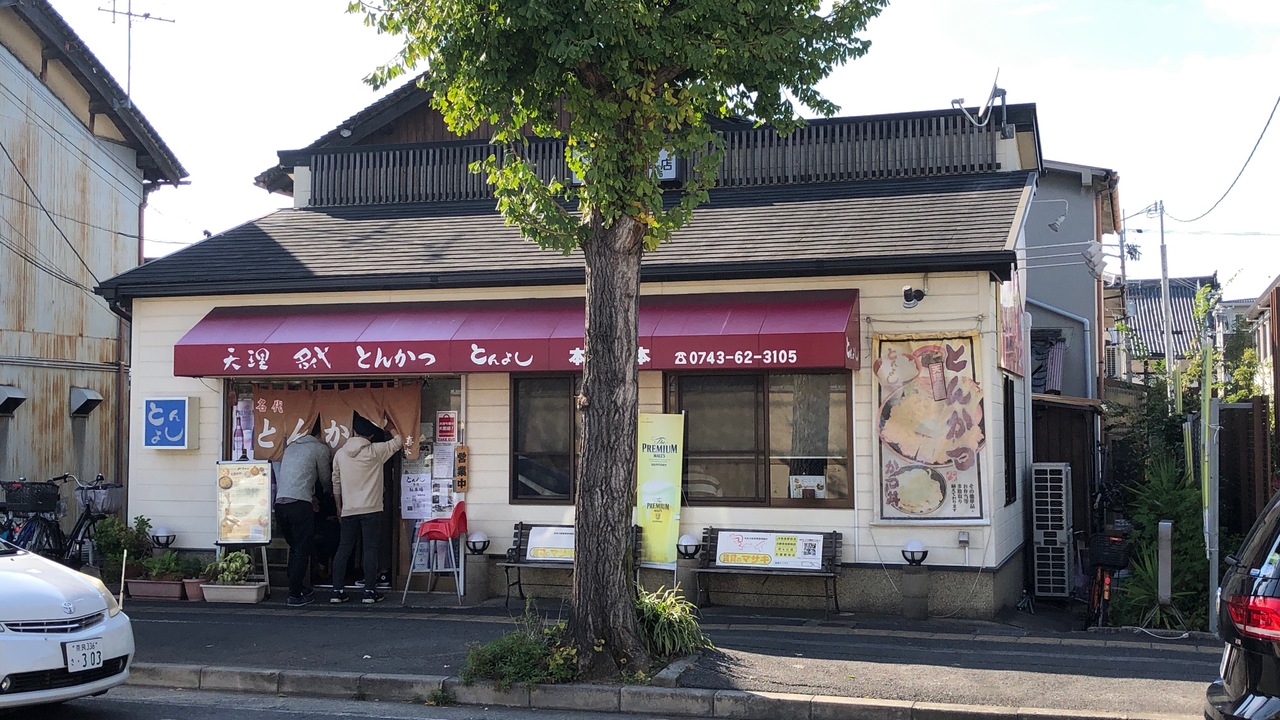 天理大学体育学部の近くにある豚カツ店です。この付近には、学生のための、安くてボリュームがあるメニューを提供する店が多いです。とんよしのかつ丼は、一番小さい普通サイズ700円でも、カツが2枚のっています。ピーク時は、店の外までお客さんが並びます。