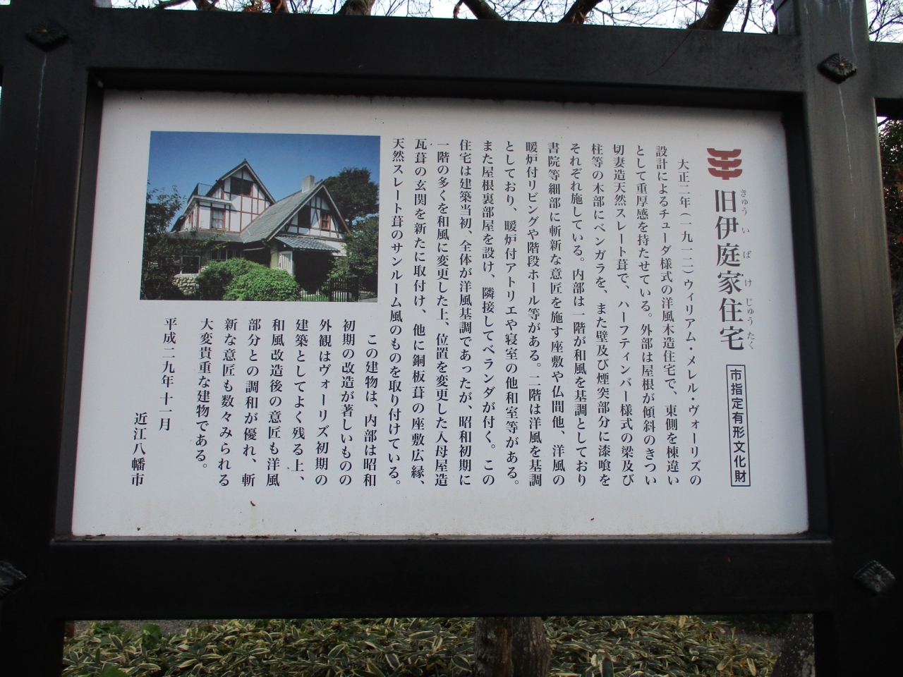 安土駅から南へしばらく歩いたところにあります。文芸の郷から自転車で向かったのですが、途中道に迷いました。なんとかたどり着けました。門は閉まっていて外観のみ見ました。旧伊庭家住宅は大正2年に建築家ヴォーリズの設計により建築された木造住宅です。初期の作品だそうです。洋風の外観ですが、玄関周りは和風でした。家の前は駐車場敷地なのでゆっくり見れました。中も見てみたかったです。