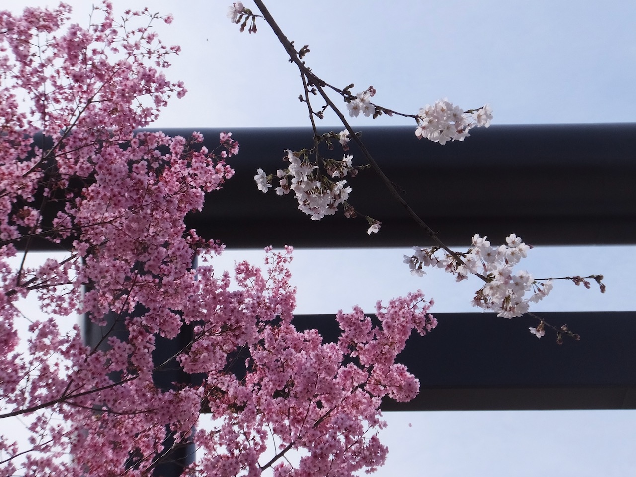 ここから境内がの参道はイチョウ並木で、桜との取り合わせはピンポイントでここの左隅のみ。紅白あってきれいです。鳥居の茶色をバックに色が映えること。かくれた名所かもしれません。