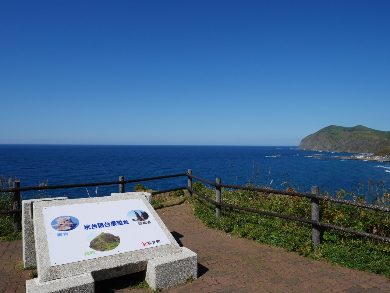 桃岩、猫岩を望める展望台です。階段を上った先に展望台があります。海に浮かぶ猫岩は距離があるので小さかったですが、桃岩は間近で迫力がありました。また、ここから覗き込んだ海が美しくて感動しました。広い駐車場とトイレも完備されています。
