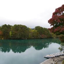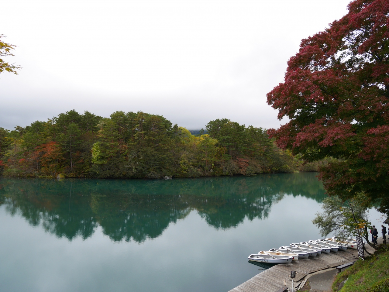 五色沼散策をしてみたかったですが、時間や体力を考慮して宿で教えていただいた毘沙門沼を訪ねてみました。駐車場からも近く、土産物店脇の整備された道を進むとすぐに沼が見えてきます。沼の色が緑がかり、周りの木々も紅葉して綺麗でした。錦鯉がいてちょっと驚きました。