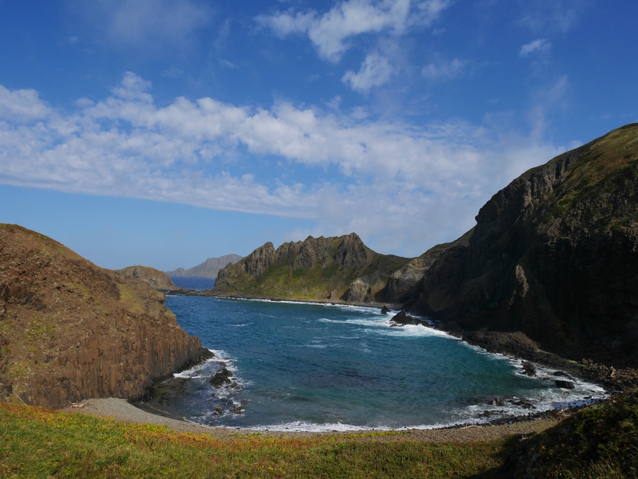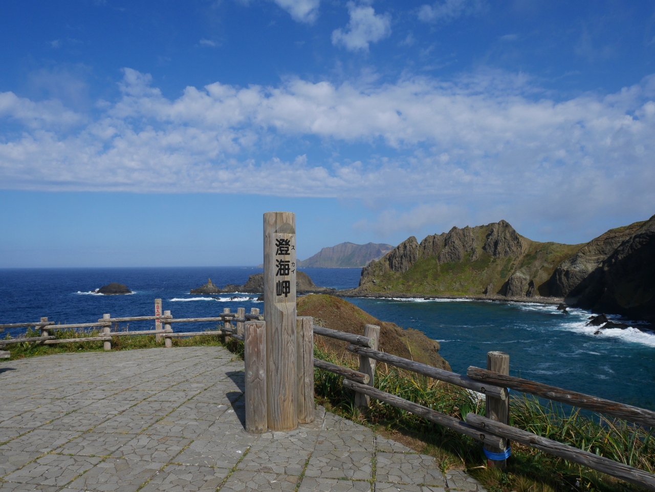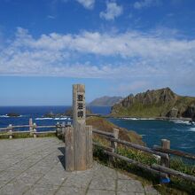名前の通り、とても綺麗な海の色を見せてくれる観光スポットです。観光バスで訪れました。駐車場から、漁港脇の遊歩道を進みます。途中、ガイドさんが珍しい形をしたレブンイワレンゲを教えてくれました。最後は急な階段を上がりきれば到着です。駐車場には売店があり、軽食もいただけます。珍しいトド肉の串刺しも売っていました。