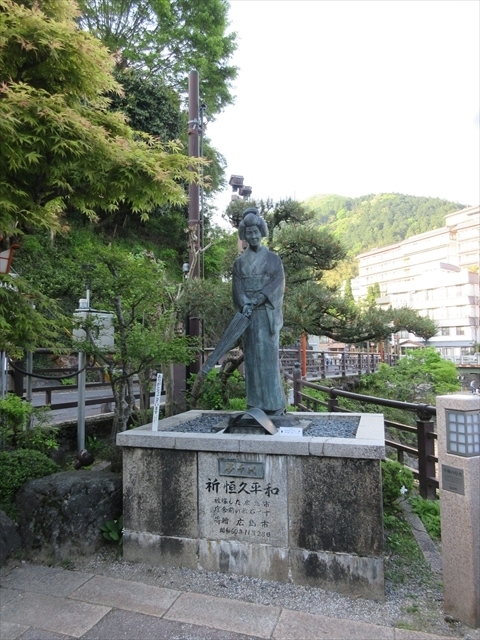 湯村温泉の奥の方にある銅像です.NHKのドラマ,夢千代日記に因んで建てられたそうですが,思ったよりは小さな銅像でした.春木川のほとりに建っていて,ある意味湯村温泉一番の観光スポットになっています.そのためか,沢山の観光客が記念撮影をしていました.