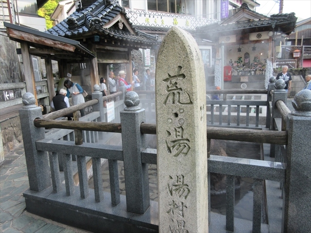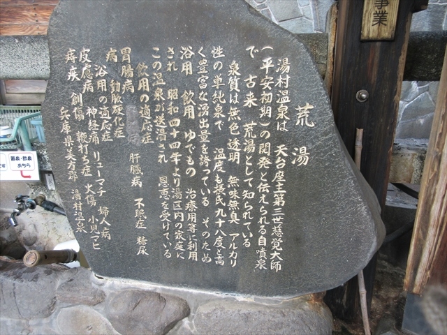 平安時代に開湯という歴史を持つ湯村温泉で,その中心部にある源泉です.アルカリ性の単純泉ですが,温度は98度もあって,温泉卵を作る場所もありました.また,飲むこともでき,胃腸病などに効能があるそうです.無料で楽しめる施設ですので,春木川を眺めながらゆっくりと足湯に浸かるのも良いかと思います.