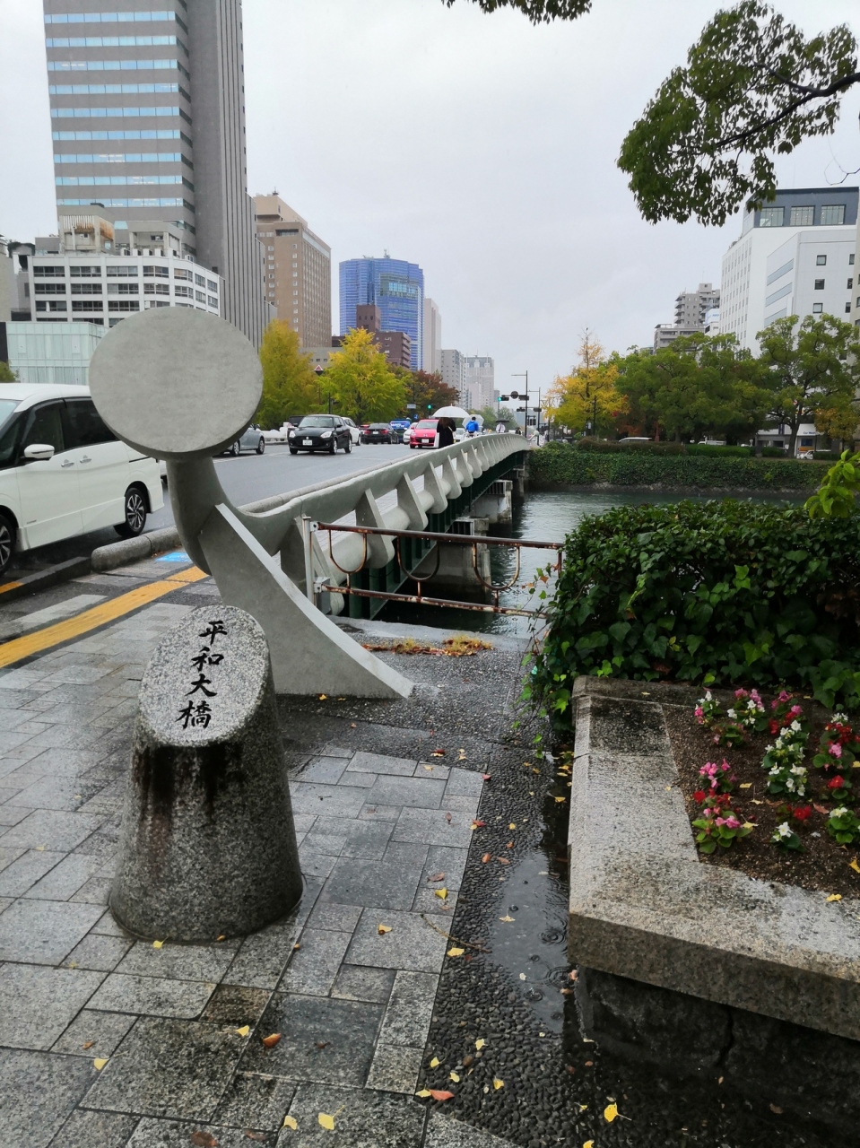 平和記念公園の南側を元安川に架かる橋です。幹線道路ですので交通量は多いです。デザインがイサム・ノグチということで欄干に特徴があります。当初のデザインではもっと欄干が低かったらしいですが、子供が落ちやすく危険ということで高くなったみたいですね。