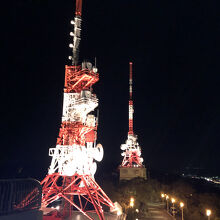 渕神社のロープウェイ乗り場から、ロープウェイに乗って行きました。稲佐山の駅から降りて数分くらいで、展望台が見えてきます。展望台の手前にはテレビ塔があり、ライトアップされていました。展望台前の広場には、ハンバーガーショップの移動販売がありました。