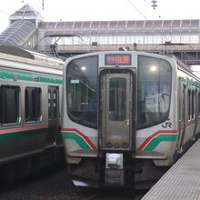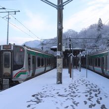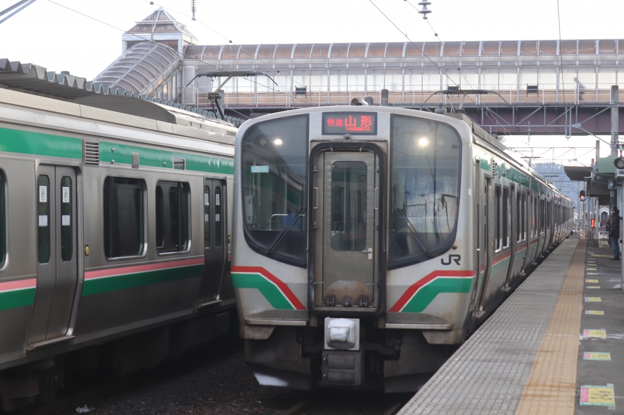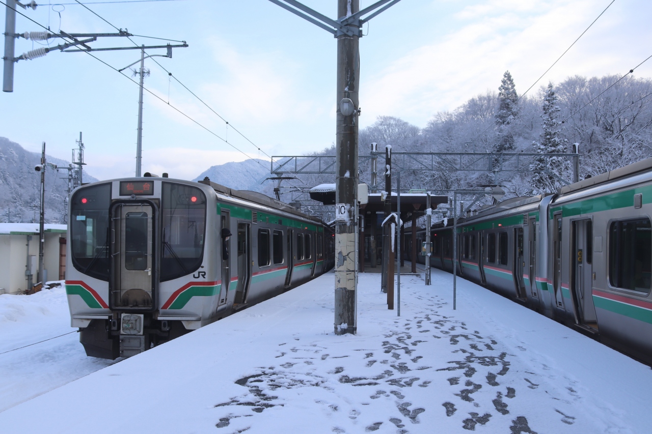 仙台と山形を結ぶJRの幹線です。仙台郊外の愛子までは本数も多いですが、先は山越えとなり県境は仙山トンネルで越えます。トンネルを抜けると美しい雪景色が楽しめます。ほどなく沿線のハイライト、立石寺のある山寺に到着します。
