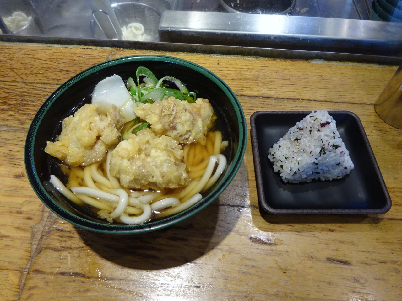 出てきたのは、鶏肉の天ぷらが3つも乗ったうどんと、わかめと梅が練り込んであるおにぎり。結構ガッツリした朝食となりました。鶏肉の天ぷらは、単体メニューでもいけそうなぐらい、やわらかくてうまかったですね。