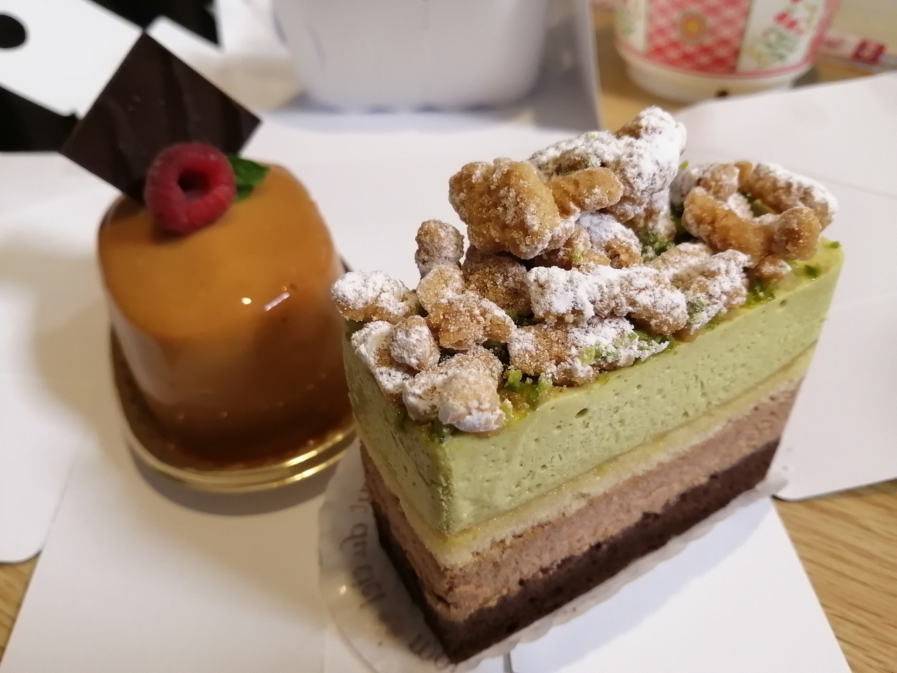 甘~いケーキが好きな方には物足りないかもしれないですが、大人向けの複雑な味の分かる人が食べる高級ケーキです。ケーキの名前は忘れてしまいましたが、一つはピスタチオのケーキ、もう一つはキャラメル味のケーキ、どちらも甘さ控えめでとてもクリーミーで好みのケーキです。平日の午前中に行き、ピスタチオのケーキは残り1つで人気の高さが感じられます。