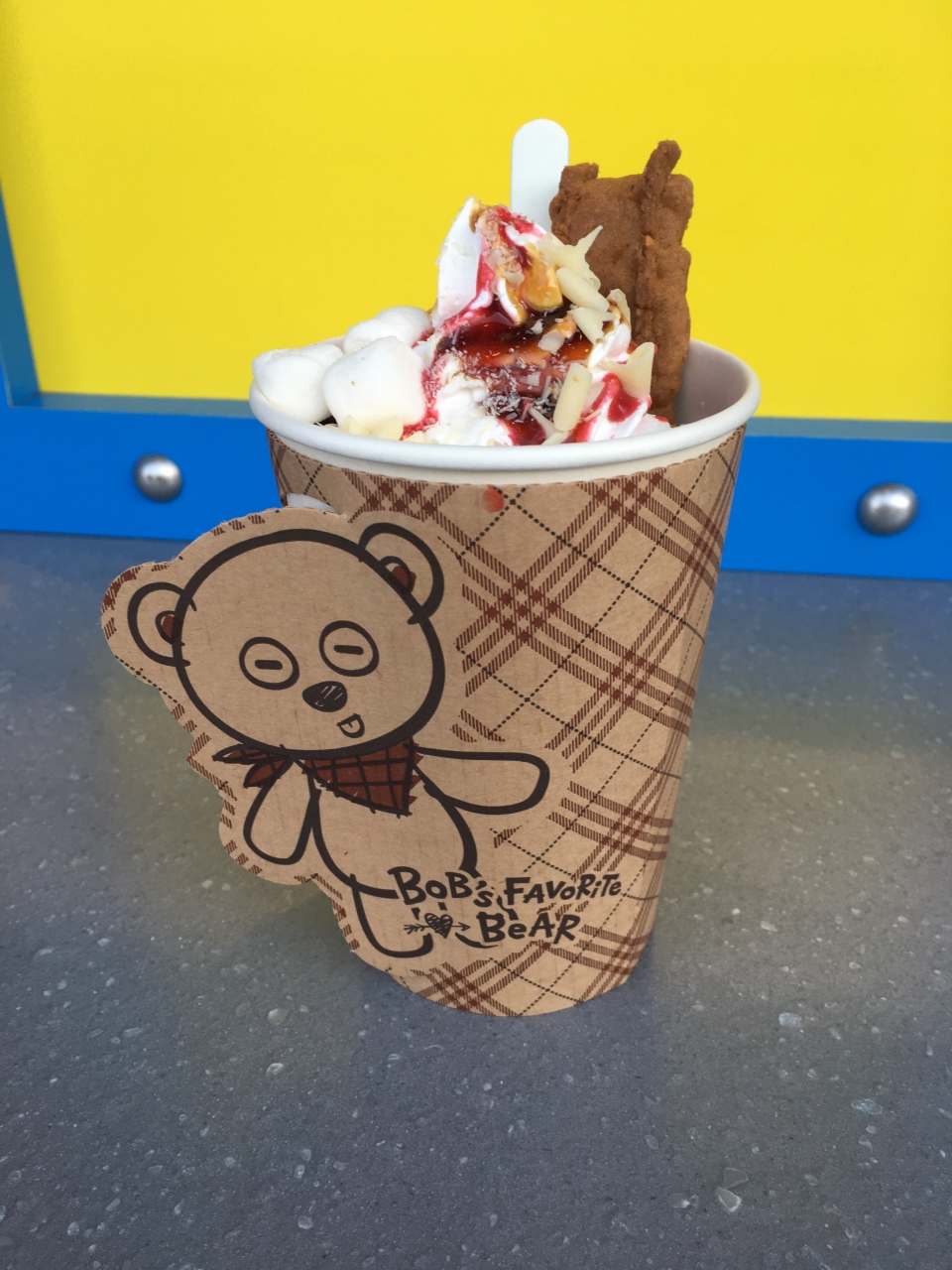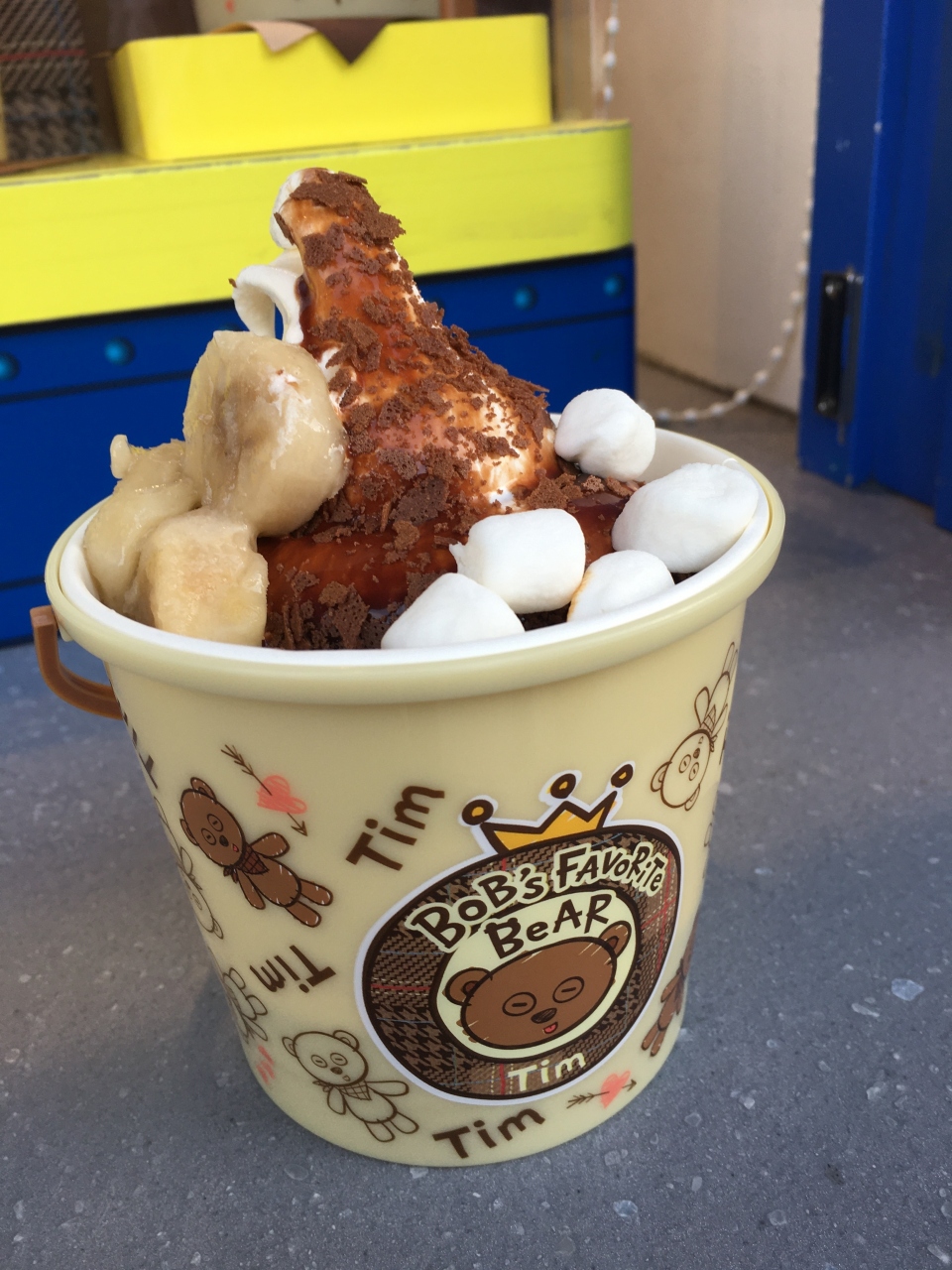 どちらもちょっとしたオヤツでいただきにはボリューミーです。ミルクティーは上に生クリームがてんこ盛り!チョコバナナサンデーは、バケツに入っていて、バケツはちょっとしたお土産になってました。