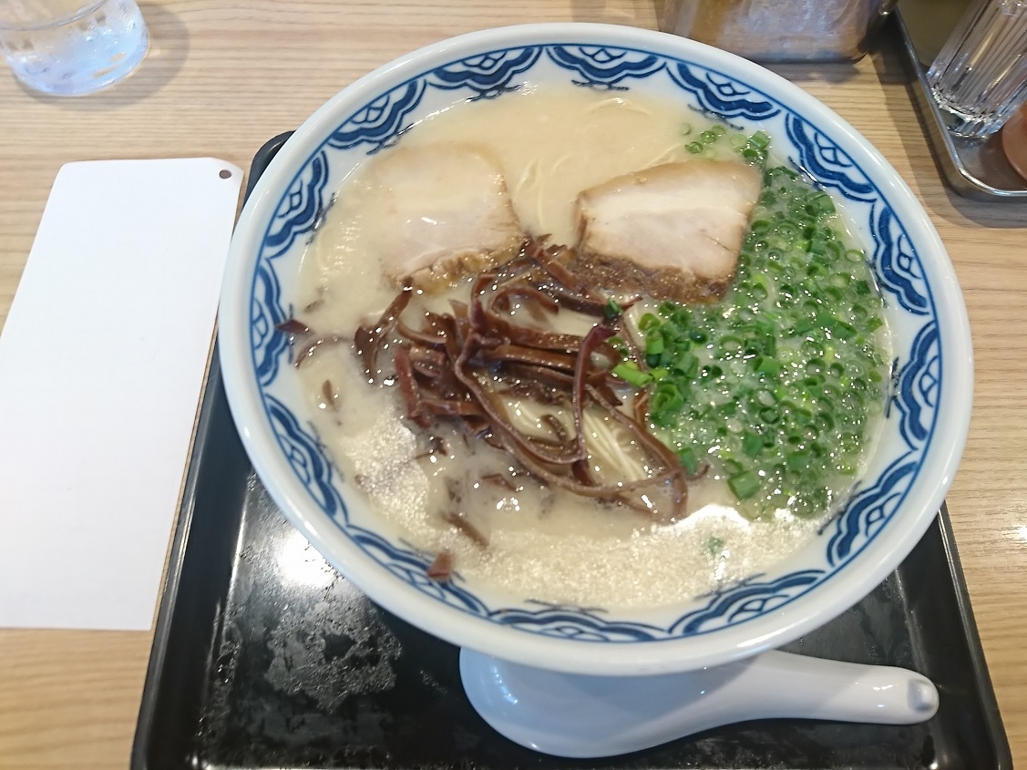 品川駅港南口の雑居ビル2階にあるチェーン店の豚骨ラーメン屋さんです。ランチで博多らーめんをいただきました。具はチャーシュー2枚、キクラゲ、ネギで、極細ストレート麵と濃厚豚骨スープの一品です。スープには豚骨特有の旨みがあり、麺にもよく絡み美味しかったです。由丸のいろいろな支店でラーメンをいただいていますが、お店によってスープの旨みにバラつきがある印象を受けました。