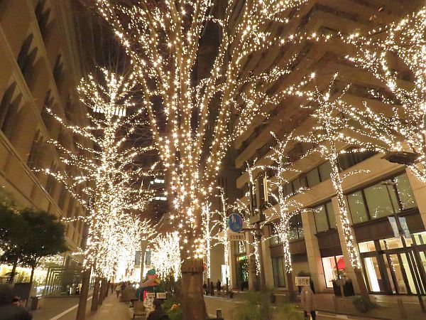 丸の内の冬の風物詩「丸の内イルミネーション」を見に訪れました。シャンパンゴールド一色のイルミネーションが、一直線に伸びるこの通りを明るく照らし出していてとてもきれいです。行幸通りをはさんで反対側の大手町仲通りでも永代通りまでの区間で同様にイルミネーションが行われています。