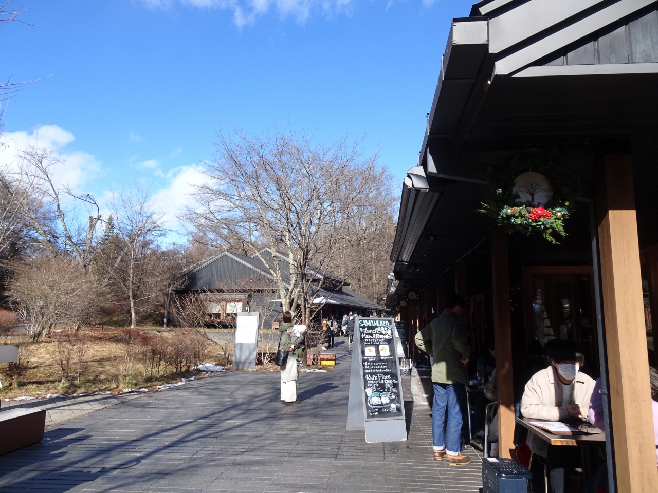 中軽井沢・星野エリアにある、ハルニレの木々に囲まれたデッキに色々なジャンルのお店が集まる場所です。