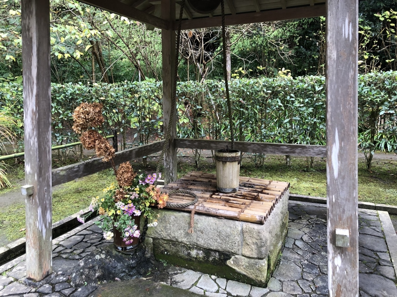 井戸はしっかりとした櫓で覆われていて、井戸の前には、きれいな切り花が飾られていました。