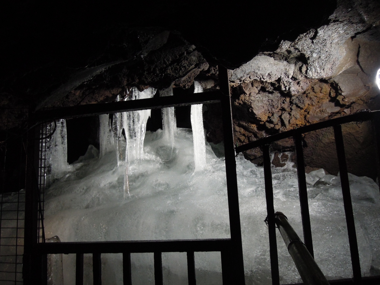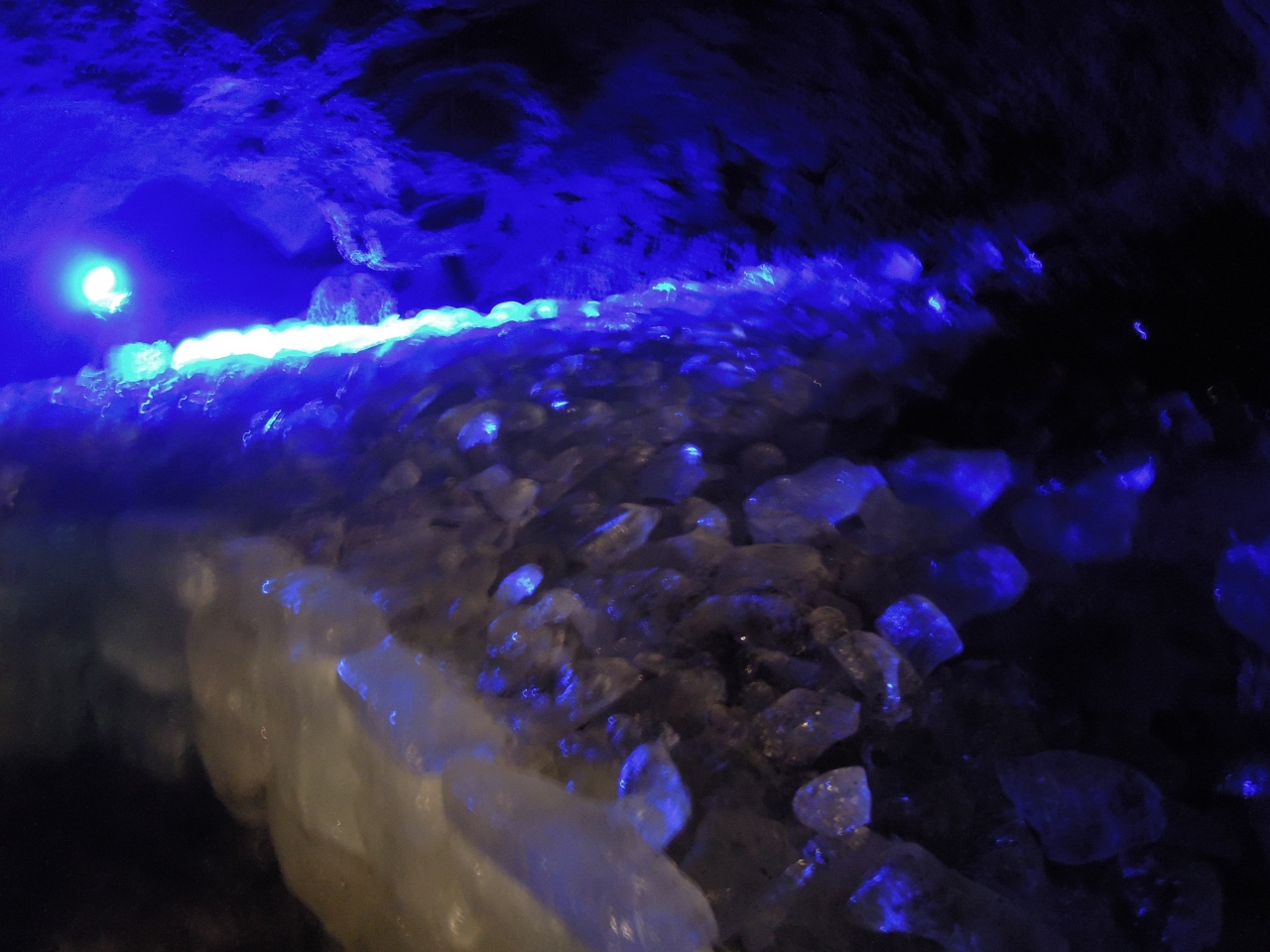 西湖でキャンプをした時に寄りました。氷穴には初めて行きましたが、思っていたより天井が低く、体勢がきつかったです。入口でヘルメットを借りてかぶるのですが、しっかりフィットしなかったせいか、頭をぶつけたり、で進むのが大変でした。寒いと思っていたのですが、さすがに真夏だったので涼しい程度でした。普通に半袖半ズボンみたいな服装でも大丈夫でした。氷がライトアップされていて他ではなかなか見ることのできない景観で、行って良かったです。