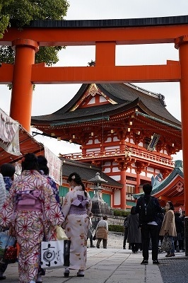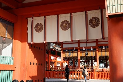 京都では庶民的な印象の代表的神社。京阪、JRの駅からゆったしりた坂道を上ると大鳥居が見えてきます。楼門をくぐるとすぐ本殿になります。朱塗りの建物この後ろにと狛狐がむかえてくれます。稲荷山に登る参拝道がありますが、こちらは登山になるので、千本鳥居をくぐった奥社奉拝所まで往復するにとどまました。