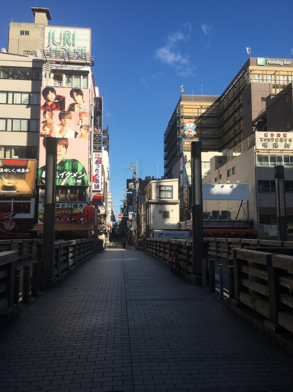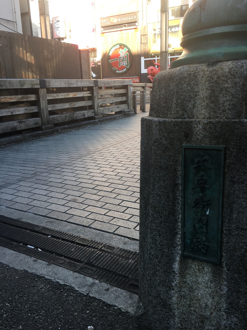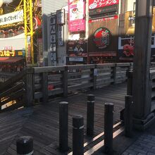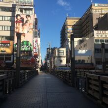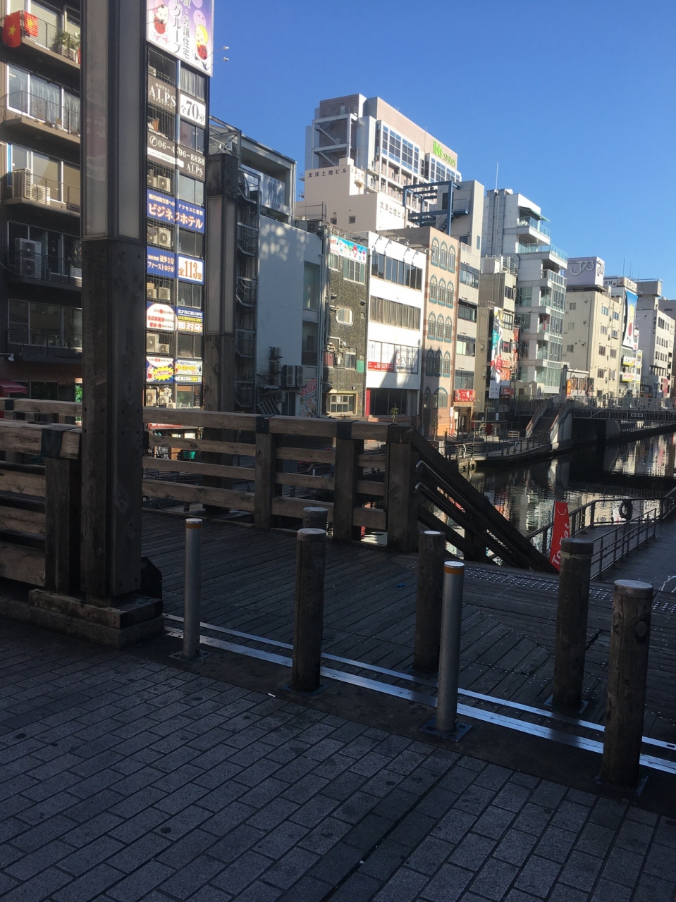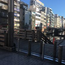 中央が石段ぽい感じで、両サイドにも道があり木で出来ていて短いながらも雰囲気が良い橋でした。両サイドは歩行者用で中央は自動車1台通れる幅でしたが自動車が走っているのは見ませんでした。下を流れる道頓堀川も短くビルに囲まれているため少し圧迫感がある橋でした。