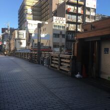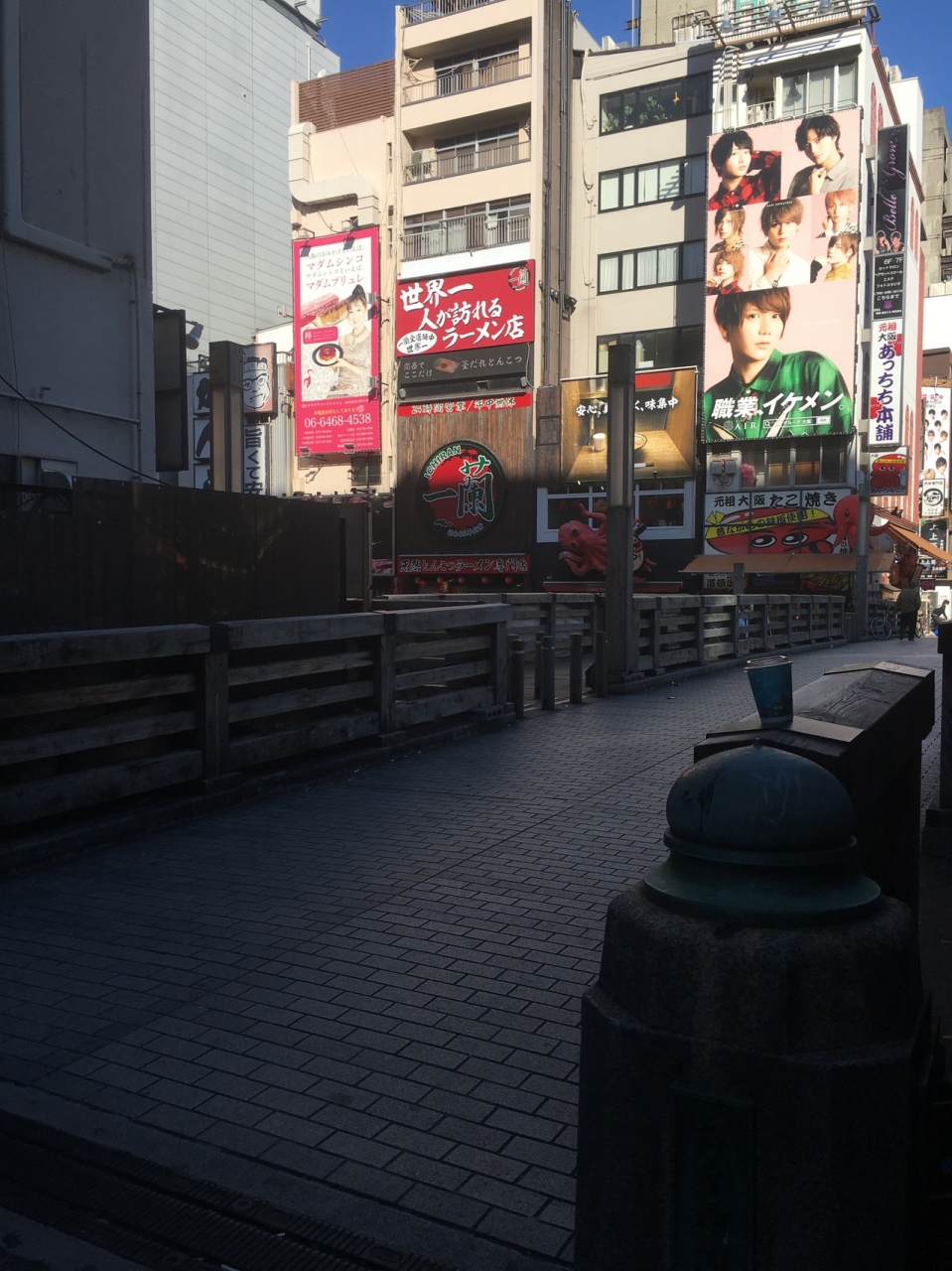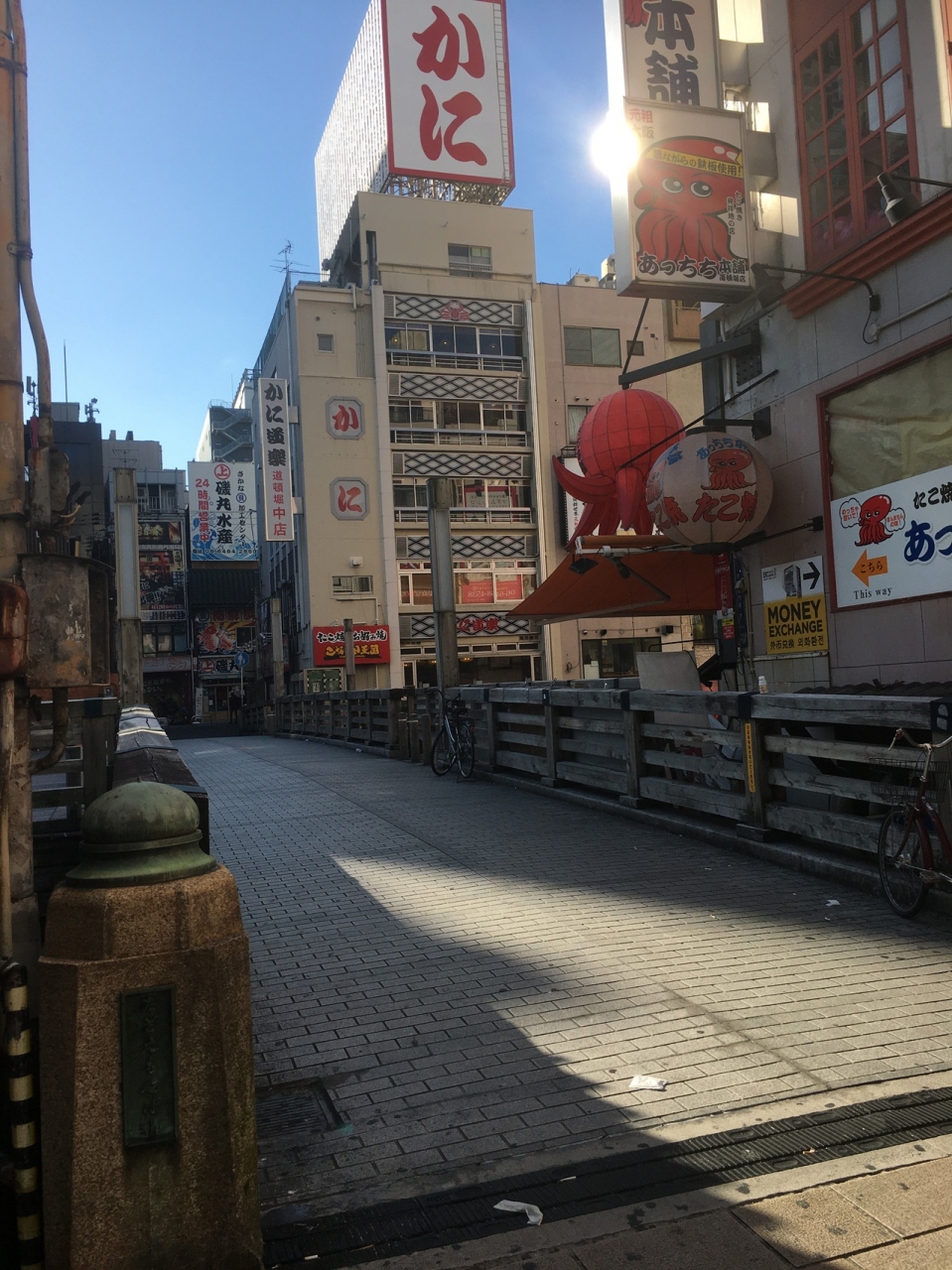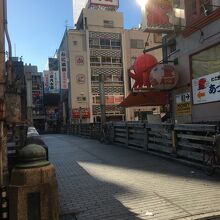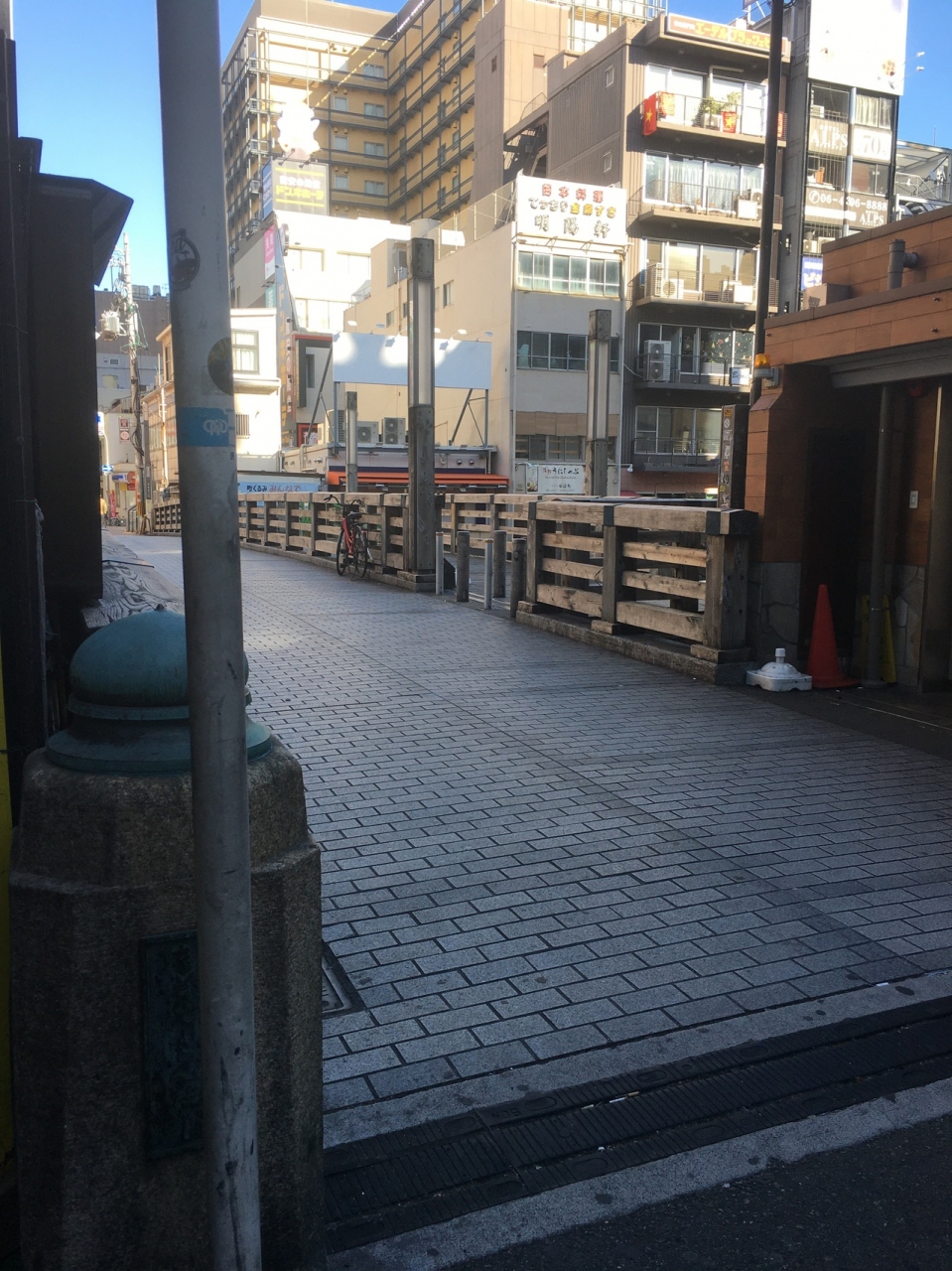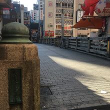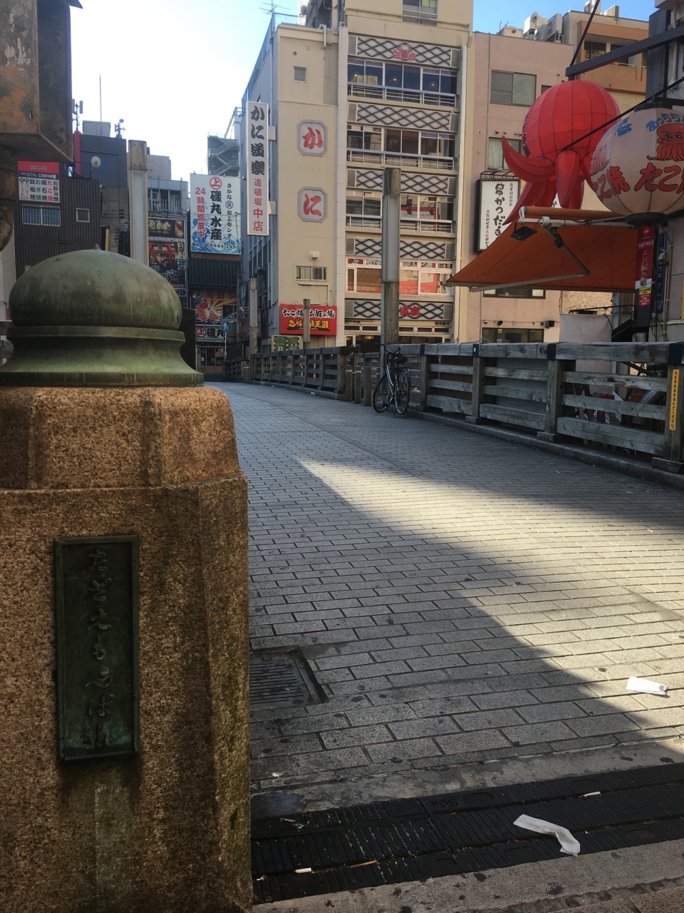 中央が石段ぽい感じで、両サイドにも道があり木で出来ていて短いながらも雰囲気が良い橋でした。両サイドは歩行者用で中央は自動車1台通れる幅でしたが自動車が走っているのは見ませんでした。下を流れる道頓堀川も短くビルに囲まれているため少し圧迫感がある橋でした。