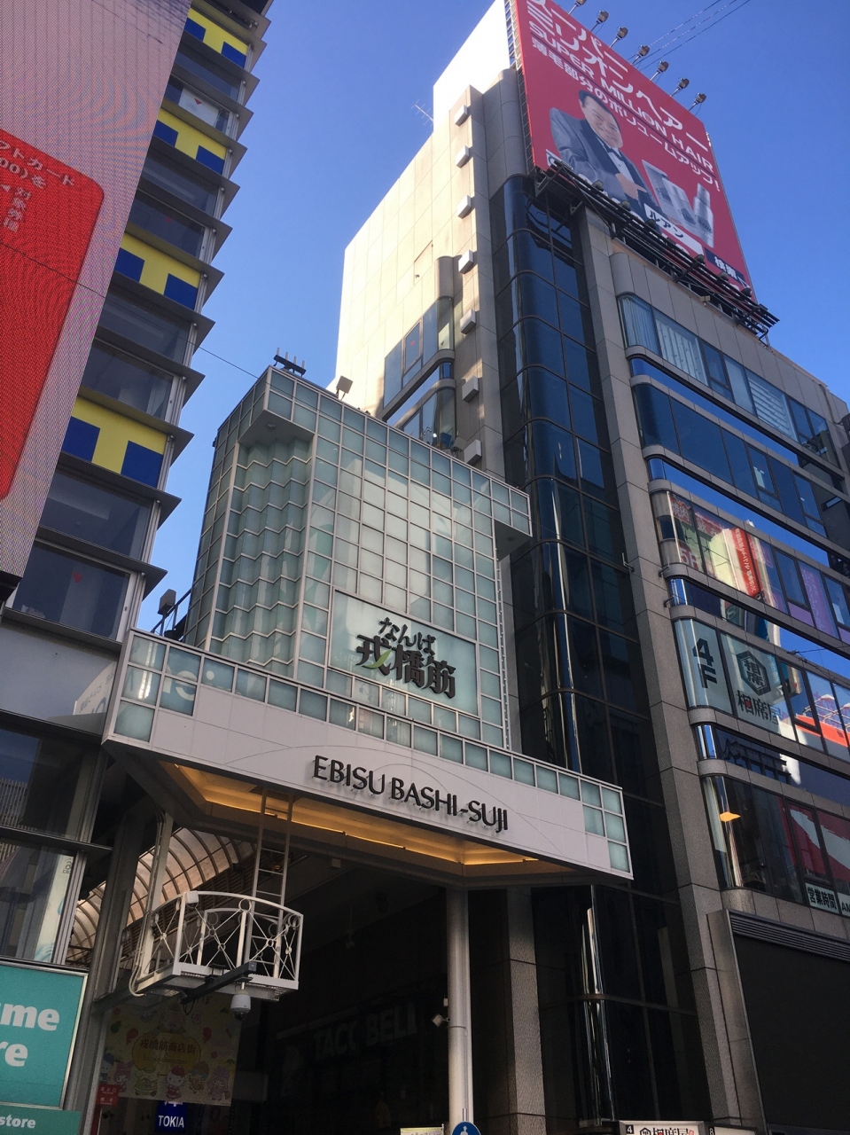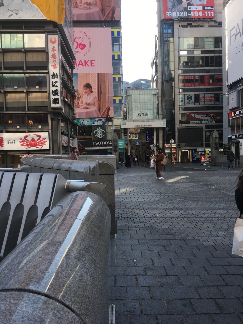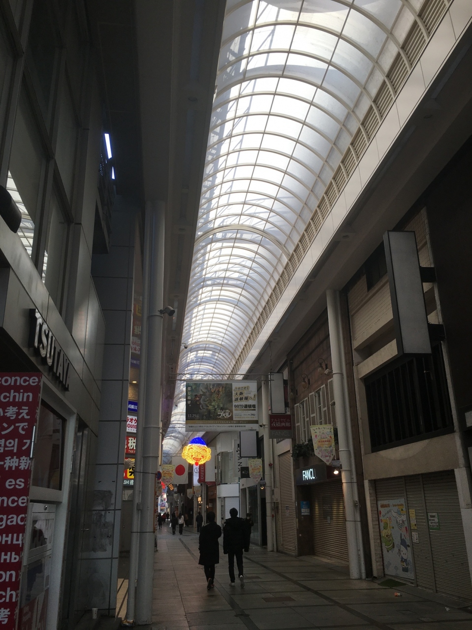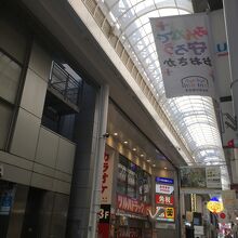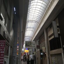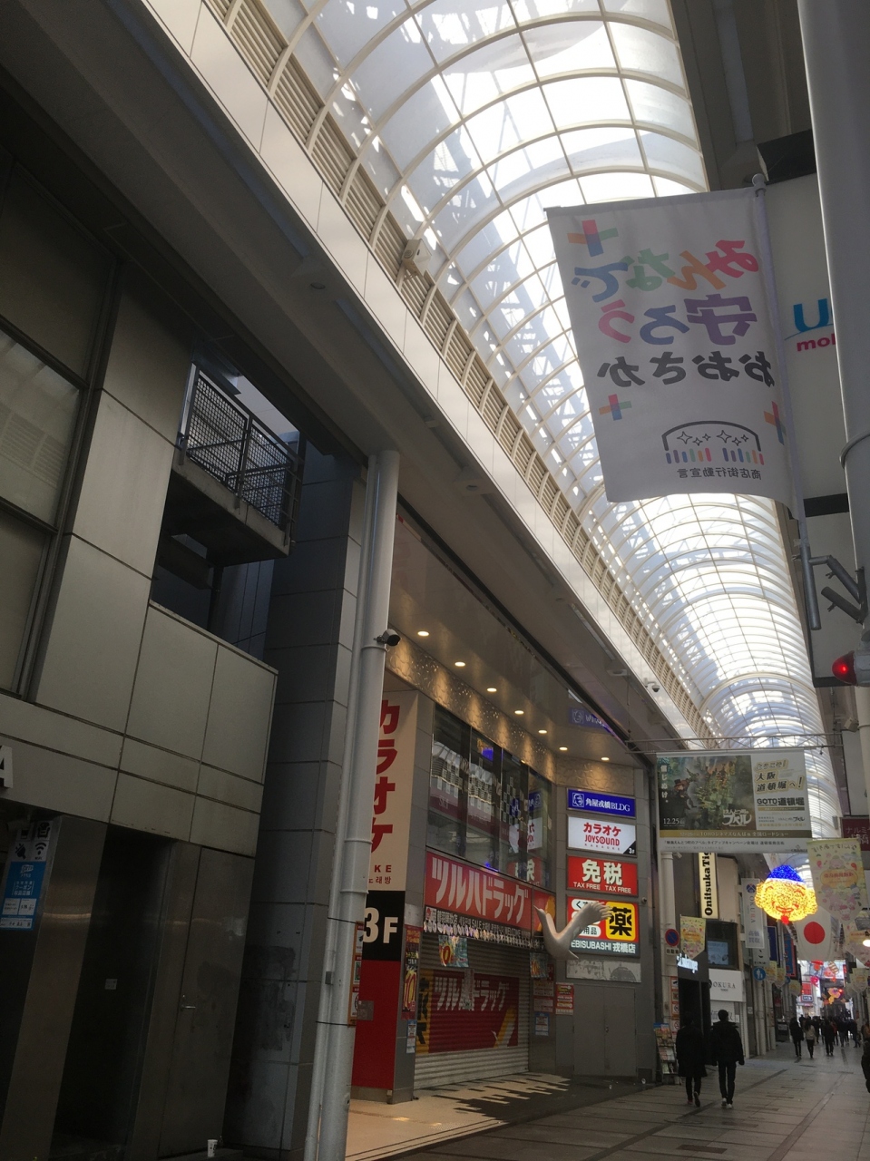 戎橋を渡った橋にあるアーケードで天井がかなり高い商店街でした。一般的な雑貨店や飲食店の他にも高級ブランド店もあり、綺麗なおしゃれな店が多かったです。左右にはビルが連なっており2階建のビルが殆どで、2階は営業してない店舗もありました。