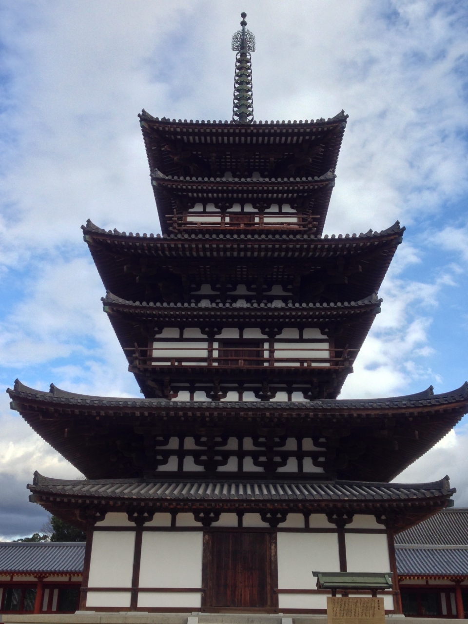 金堂をはさんで右側に有るのが東塔です。一見六重に見えますが各層に裳階が付いている為で、実際は三重の塔です。奈良時代から現存するオリジナルなので、数年かけて修復されていたのがやっと完成して全体像を見る事ができました。