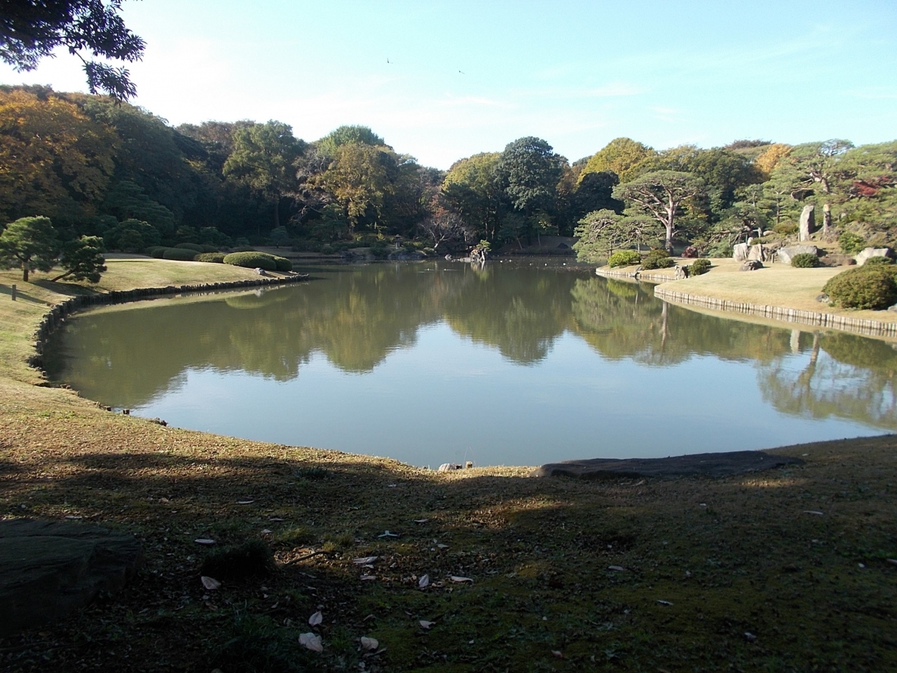 この六義園 出汐湊は大泉水という池の東側にあるほとりです。少しくぼみになっているのです。この出汐湊からの景観が素晴らしいのです。六義園でもらえるパンフレットに沿ってその景観を眺めました。説明とおり素晴らしいのです。ここから小舟を出したいようです。