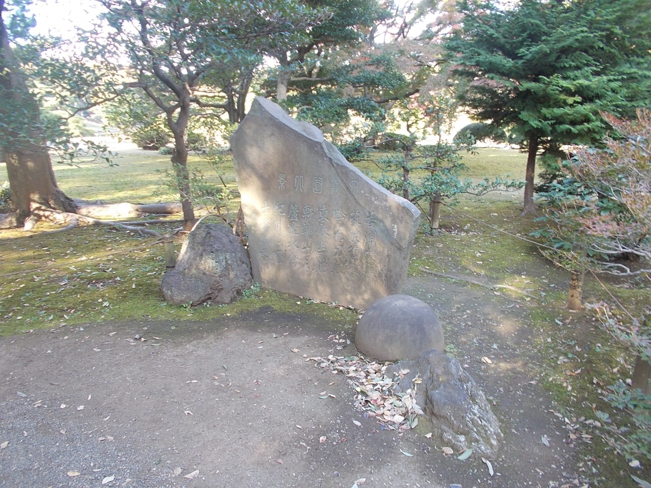 この六義園 新脩六義園碑は庭園の南のエリアにありしだれ桜の近くにあります。この石碑の脇に説明板があります。それによると柳沢吉保が当時の上皇に六義園の絵図を上程しその返礼で六義園の景観を読んだ和歌の巻物をさずかったということを記したもののようです。当時から六義園は名庭園だったのです。
