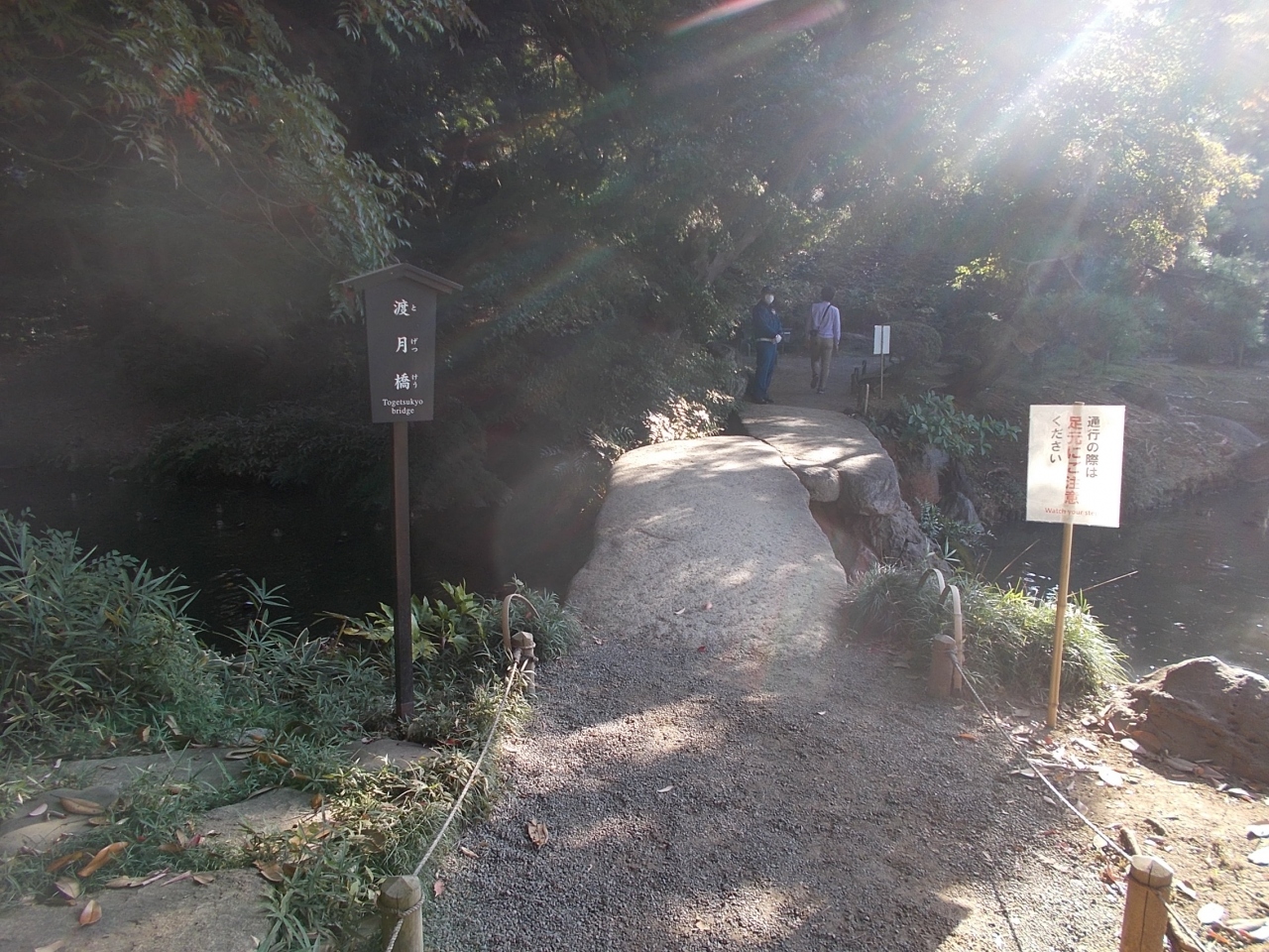 この六義園 渡月橋は庭園の池である大泉水の中にある大きな島に渡る橋の一つです。東側に面しています。この橋は石の橋です。橋の由来は和歌の句からです。「夜わたる月」という文言があります。この橋は大きな石を二枚つかったものです。味わいがある橋です。