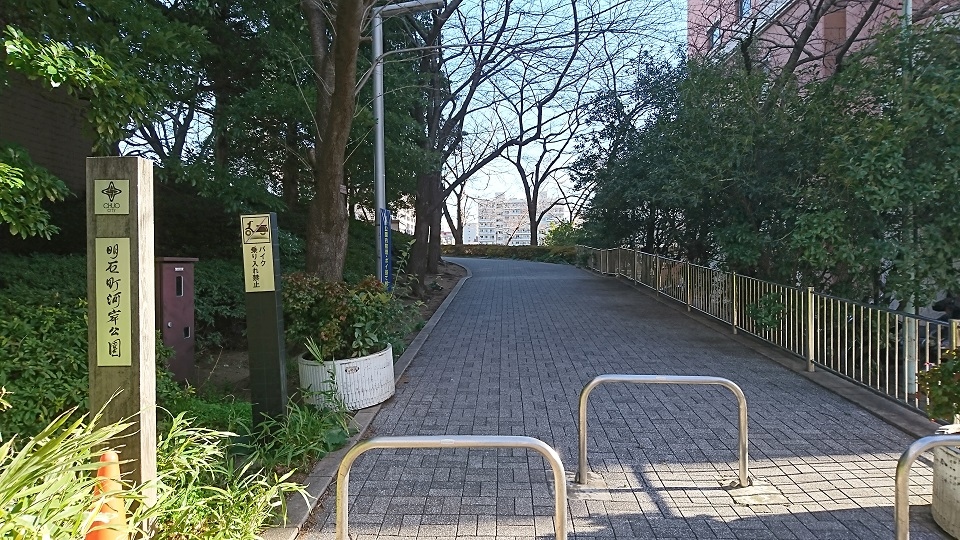 中央区明石町の聖路加ガーデン脇の隅田川沿いにある公園です。隅田川沿いに散策できるようになっていて、景色はよく、歩いていて気持ちの良い公園です。隅田川沿いには隅田川テラスが整備されていますが、隅田川テラスと明石町河岸公園の境目が良くわかりませんでした。
