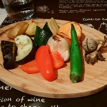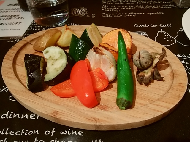 土佐野菜のグリルは、じゃがいも、なす、ズッキーニ、パプリカ、にんにく、おくら、にんじん、ふきのとう。塩がパラリと振ってあります!