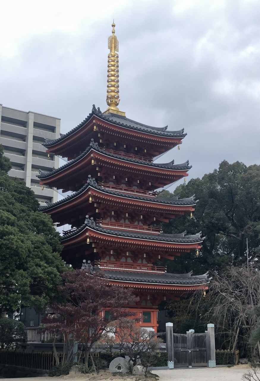 地下鉄祇園町で下車し、すぐの場所にあります。空海が日本で最初に創建したお寺です。大仏殿は有料ですが、お庭は無料で入れ、この季節、黄色い蝋梅が咲いていて綺麗です。秋には五重の塔と紅葉がコラボして、どちらの赤も大変綺麗です。