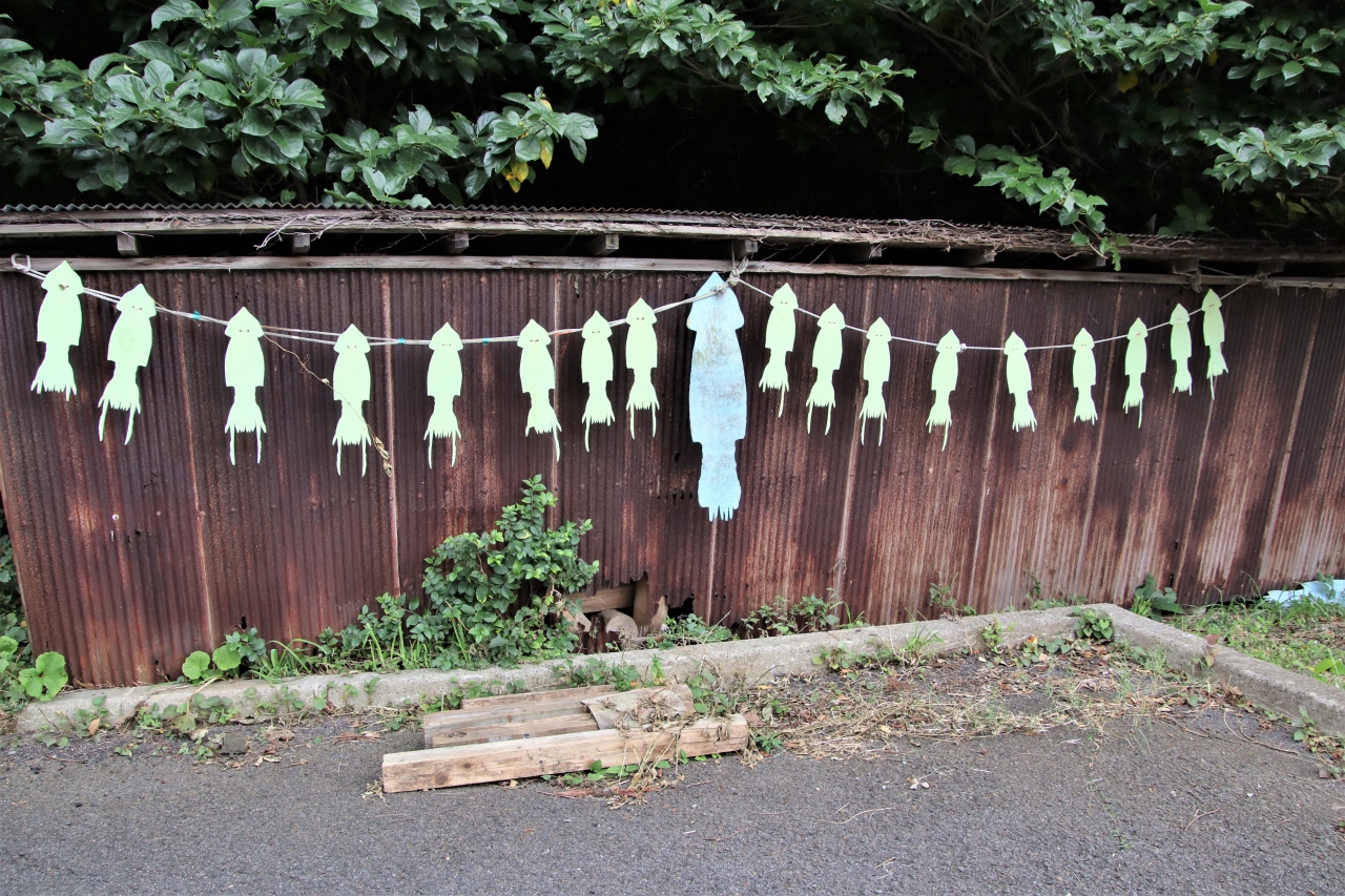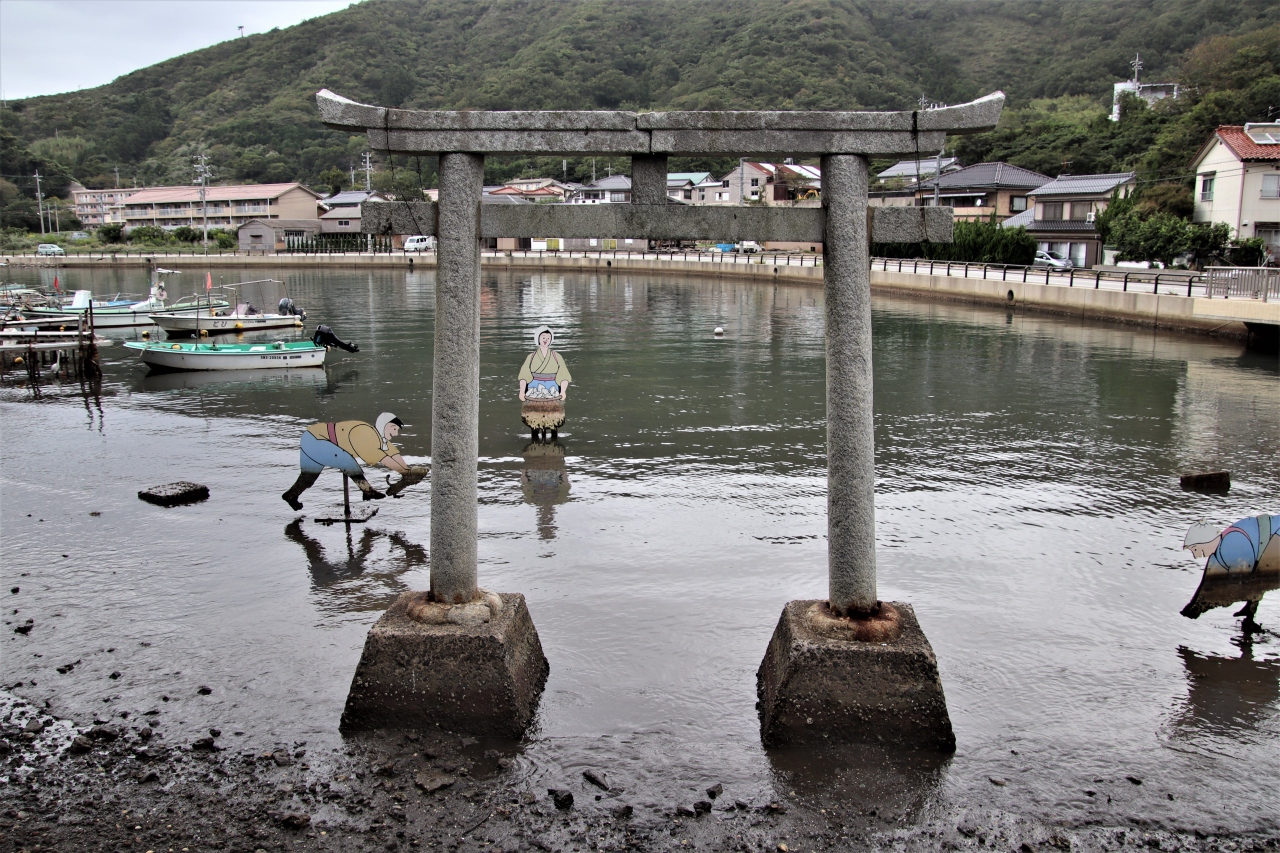 神社前の由良ノ浜には毎年10月になると『イカ』が押し寄せる。(イカ寄せの浜)