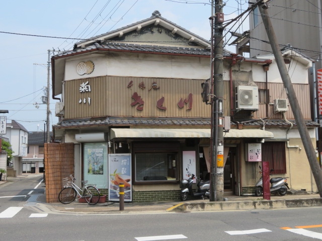 JR五條駅から程なく行った本陣交差点にある和菓子屋さんです。壁に書かれた「きく川」の字体を見ただけで、地元の老舗であることがわかります。外にポスターがあった若鮎をいただきましたが、丁寧に作られた和菓子だという印象を受けました。