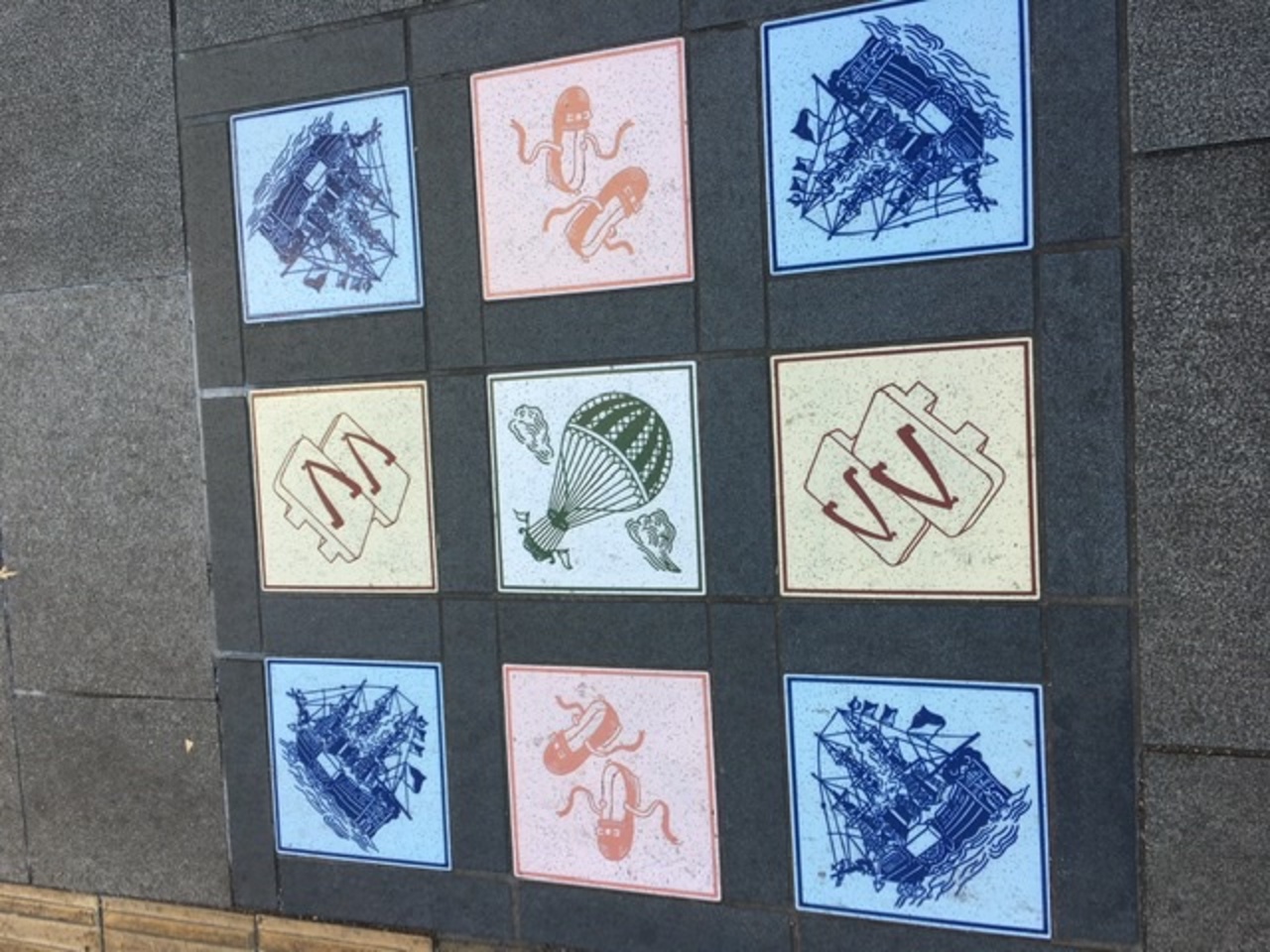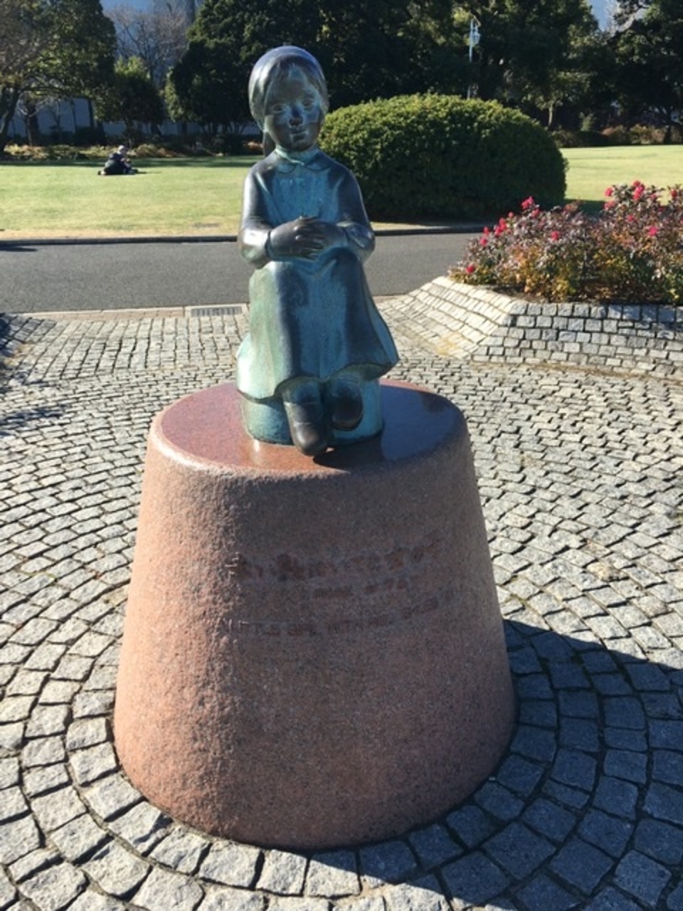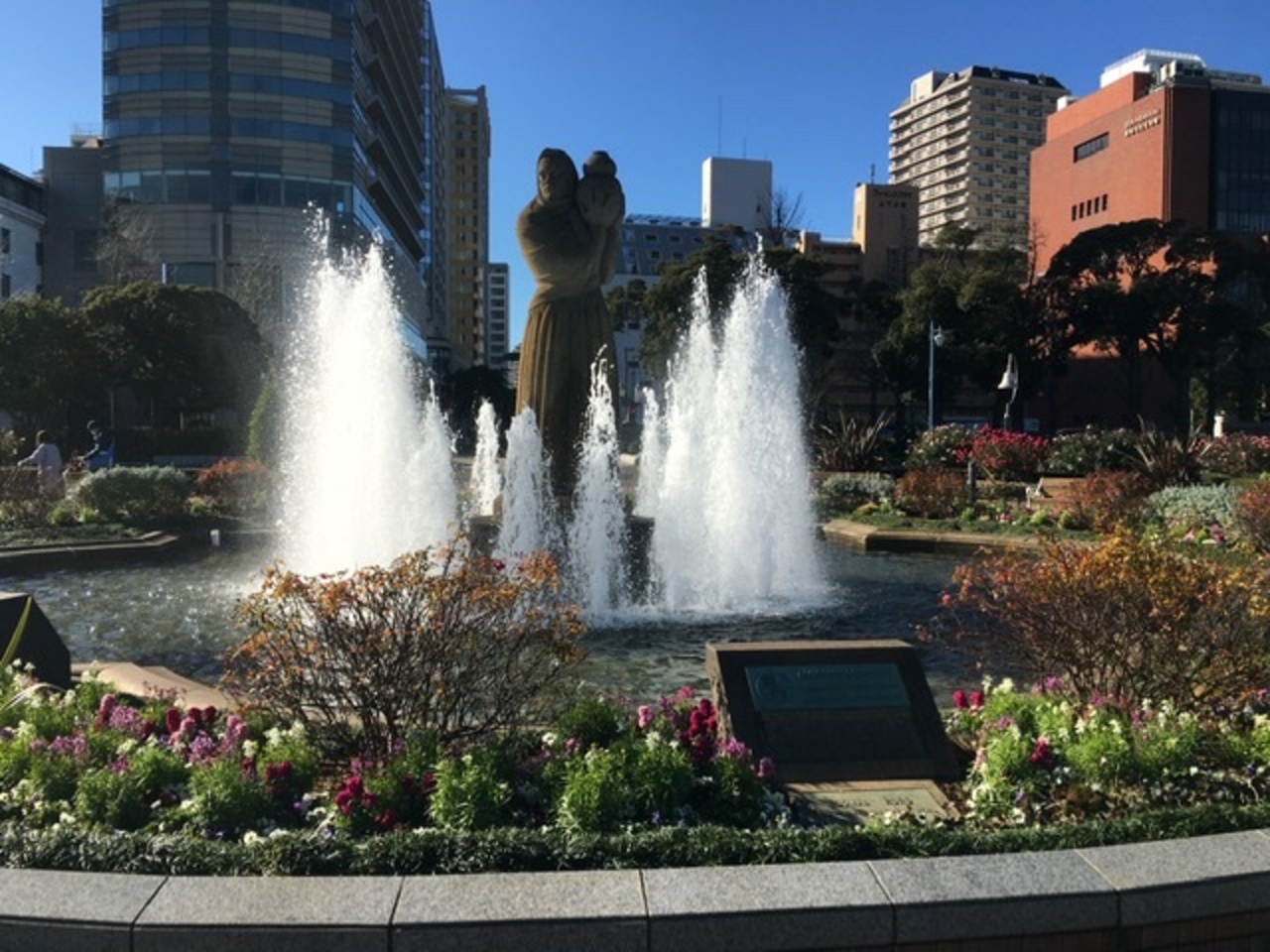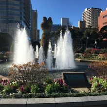 中央広場には噴水があり、赤い靴をはいていた女の子の像もありました。