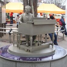福島駅東口(在来線口)の駅前にあります。福島市出身の作曲家でハモンドオルガンを弾く像です。2009年の生誕100年を記念して建てられたものです。2020年のNHK朝ドラで紹介され、一気に注目されました。