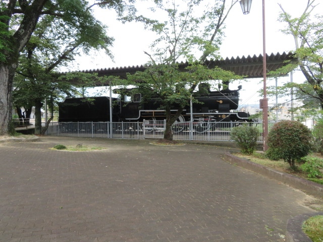 こちらの最初の五條代官所は焼き討ちに遭い、後に再建されました。公園のど真ん中には、長屋門である民族資料館があります。明治維新発祥の地ということで、それに関する資料も展示されています。あとなぜか蒸気機関車もありますよ。