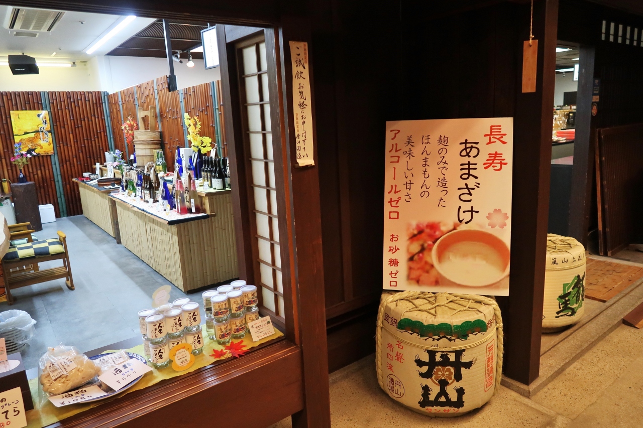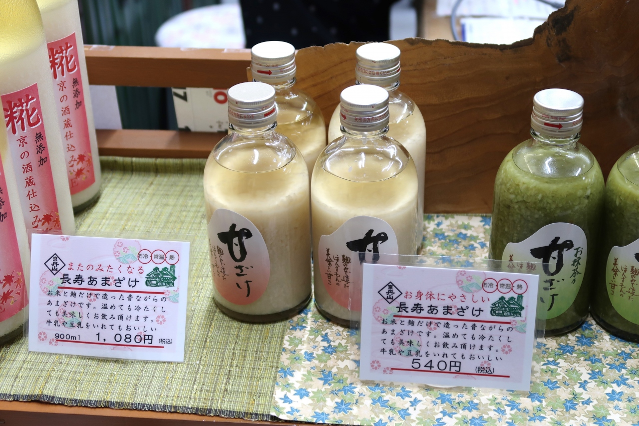 京都文化博物館の中に、江戸時代末期の京の町家の表構えを復元した「ろうじ店舗」が並んでおり、レストランなどを通り過ぎると「長寿あまざけ」の看板が目に入る。麹で作ったほんまもんのキャッチと現物を眺めていると、お店番の女性が出てきて、お酒の試飲できますよと誘われて、何かおみやげになるものはあるかと店内へ。普段、日本酒はあまり飲まないのですが、オーガニックとのことで勧められるままに試飲、最初のものは辛い感じで、次に熟したのを勧められ、思わず「これは丸い」と言葉が出る。それぞれ小瓶で1000円前半だったので、珍しく日本酒(雪月花嵐山と完熟)を購入、これに甘酒もつけて、試飲つきで充実の日本酒の京みやげとなりました。