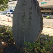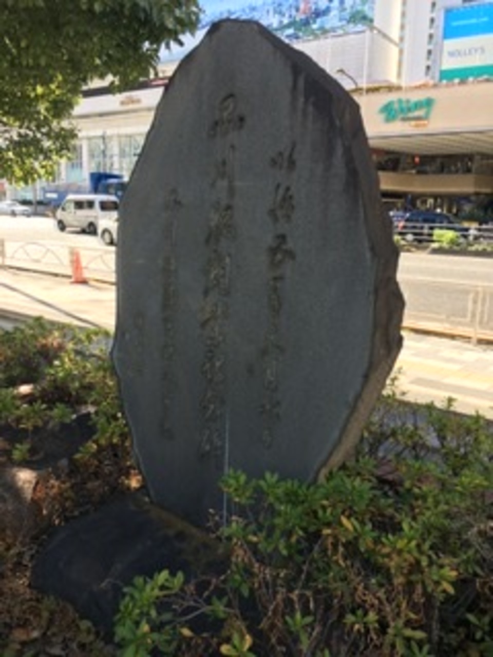 品川駅の高輪口のロータリーにありましたが、そのロータリーの中央部分にはタクシーやトラックなどが多く駐車しており、その影響で残念ながら石碑がよく見えません。やむなく行き交うタクシーを避けながら渡りその場所に行きました。黒っぽい石に文字が書かれていますが、駐車する車が邪魔して正面に回ることが出来ずよく読めませんでした。品川駅の再開発が終わったらもっとよく見える場所に移設した方がいいですね。
