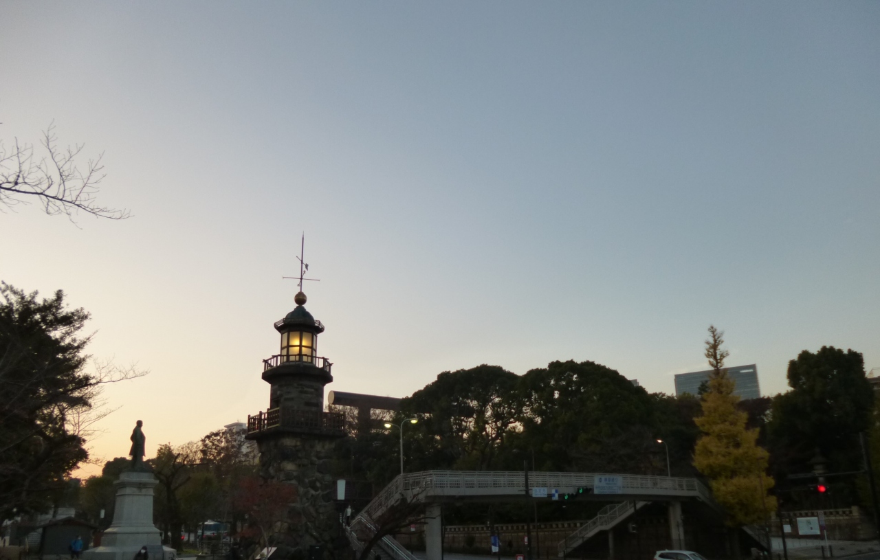 九段下の駅から田安門へ向かって坂を上がって行くと、左手に武道館が見えてきます。正面には、美しい形の高燈篭が見えます。お堀沿いにある小さい公園が九段坂公園です。公園内には、品川子爵や大山元帥の銅像があります。すぐ近くに、お向かいの靖国神社へ向かう歩道橋があり、そこからも見渡すことができます。
