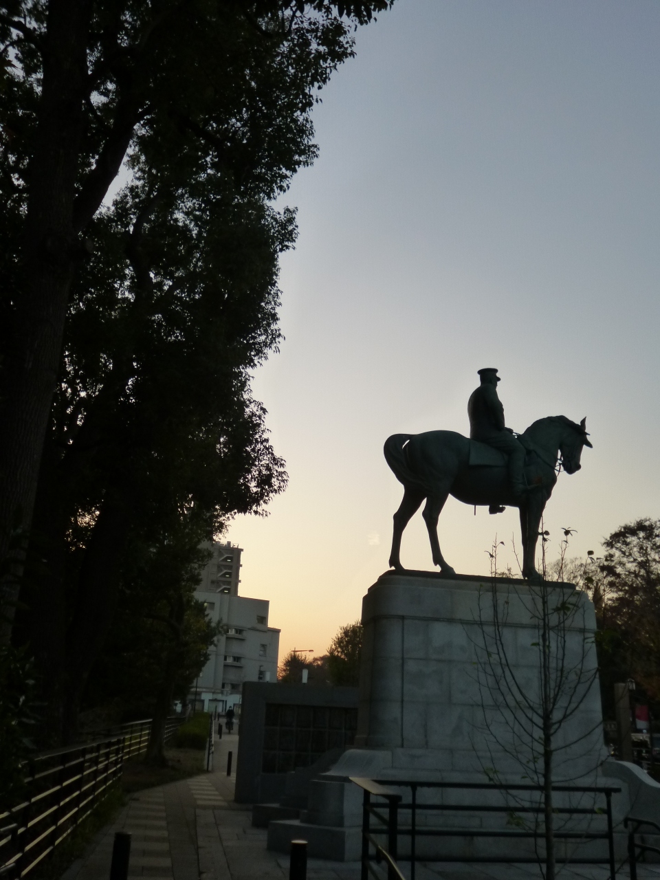 武道館に近い、田安門の近くに、九段坂公園という名のポケットパークがあります。その中に、高燈篭や品川子爵の銅像に並んで、馬にのった大山元帥の銅像があります。造られたのは、大正8年で、現在は国会の近くにあって尾崎庭園となっているん場所にあったそうですが、移設されたようです。で薩摩藩出身で、日露戦争では陸軍司令官、初代の陸軍大臣となった人だそうです。似ていると思ったら、北の丸公園の北白川宮能久親王騎馬銅像を造ったのと同じ人の作品だそうです。