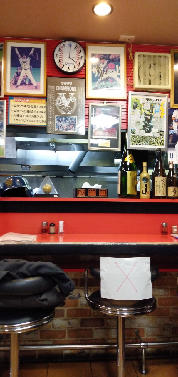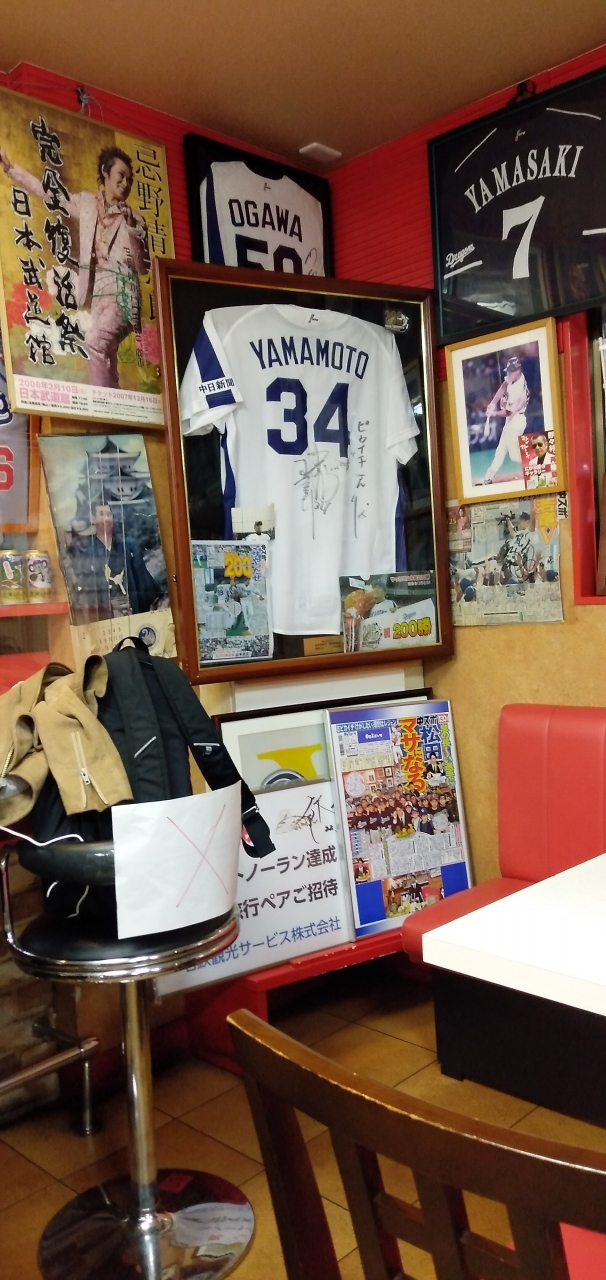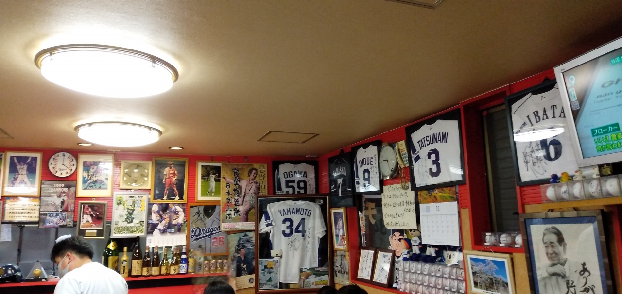 中日ドラゴンズ選手のサイン入りユニフォームやグッズであふれかえった、さながらドラゴンズミュージアムな店内です。お料理も、しっかり出来たお品で、イカトンビの辛し炒めや、ごぼうと細切り肉炒めなど、他では無いビールのお供に最適なお品が多いです。
