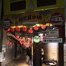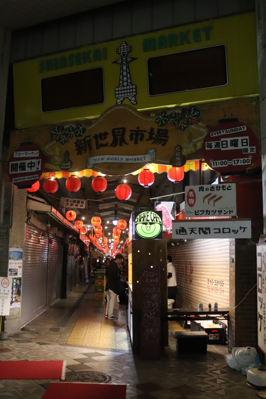 通天閣から近い路地の小さな商店街です。訪れたのも遅かったですが、赤い提灯だけが目立つシャッター通りでした。ちょっと踏み込みずらい雰囲気です。これでも日曜の昼間はフリーマーケットが並び、にぎわうそうです。