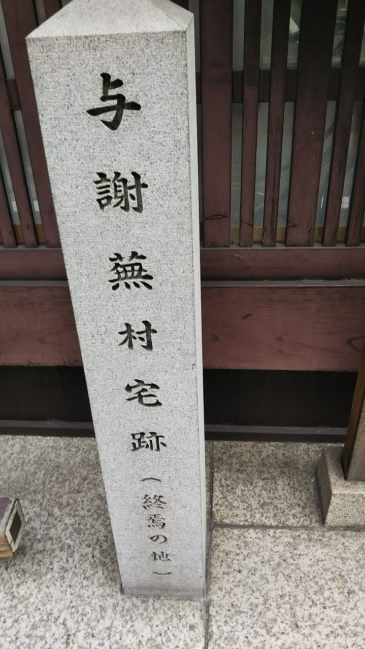 烏丸仏光寺西にすすんだところに石碑と駒札がたっている。いろいろなところを渡り歩いていた与謝蕪村が最後に住んでいた場所。今はもうないけど昭和まではここに路地があったとのこと。その路地の南に住処があった。そして数々の名作が生まれた。いろんなところに住んでいたのに再び京都に戻ってきたということは、京都が住みやすかったということなのかな。見つけやすい石碑だと思う。