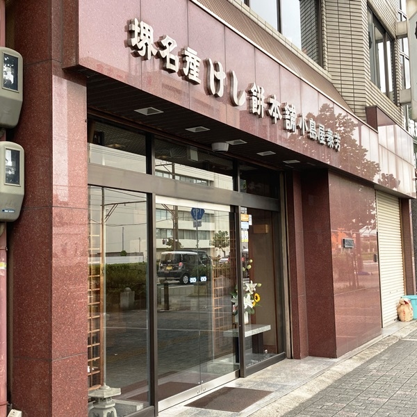 タイムスリップしたかのような雰囲気のお店、目の前にはチンチン電車が通っています。駐車場の場所がよく分からず、家族に車で待ってもらって買いに行きました。堺の名物、けし餅の老舗で、周りにびっしりとついたけし餅が、ノスタルジックな箱に入って売られています。時節柄、ビニールカーテン越しの接客です。
