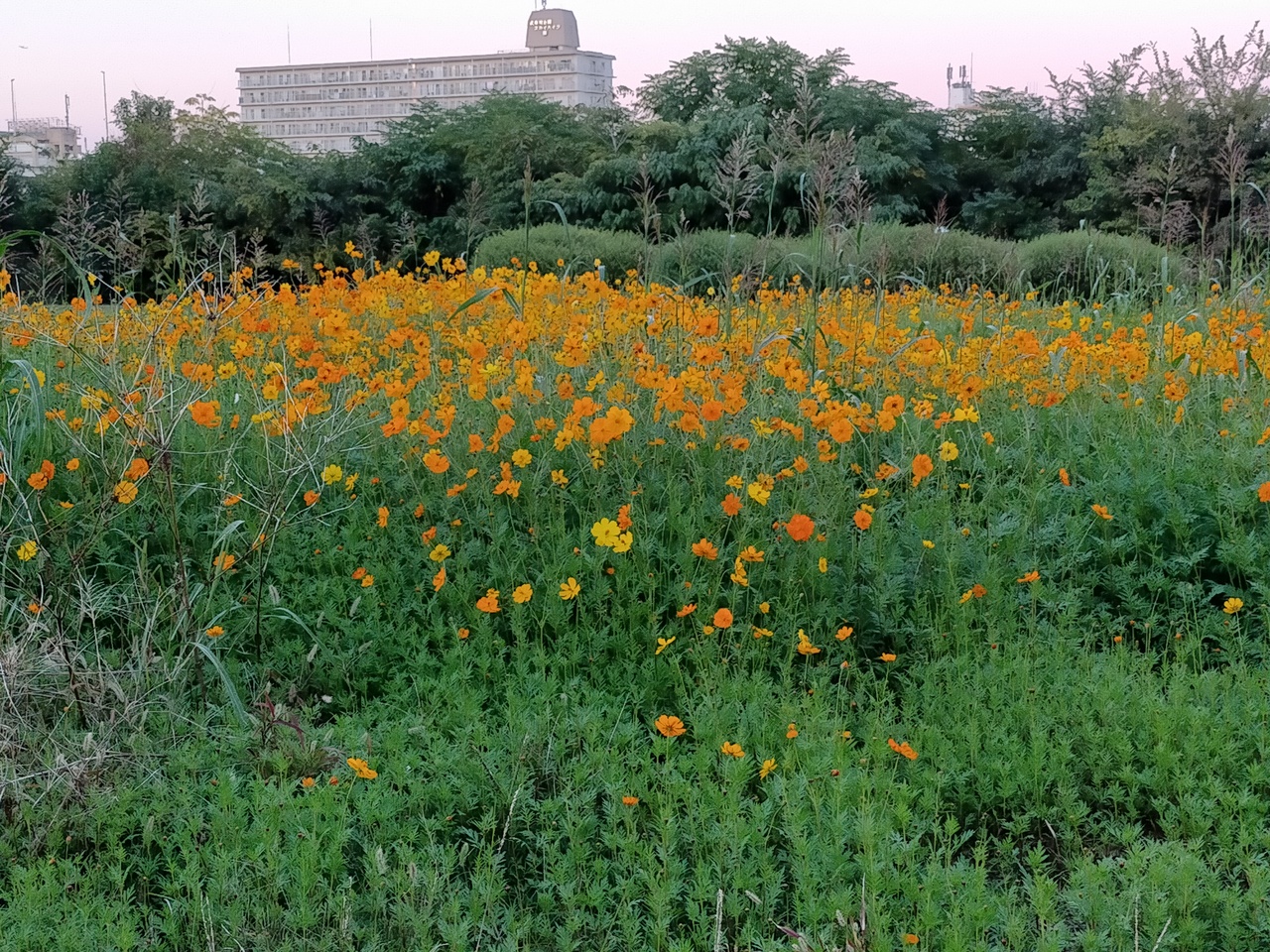 武庫川河川敷にある緑地です。10月の始めに自転車で通りました。毎年、秋には多くのコスモスが美しく咲いていましたが、今年は新型コロナの関係のためか、オレンジ色の花のみが咲いていました。残念でした。来年に期待です。