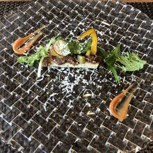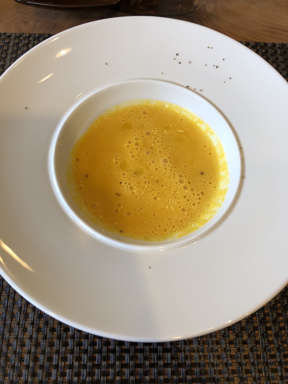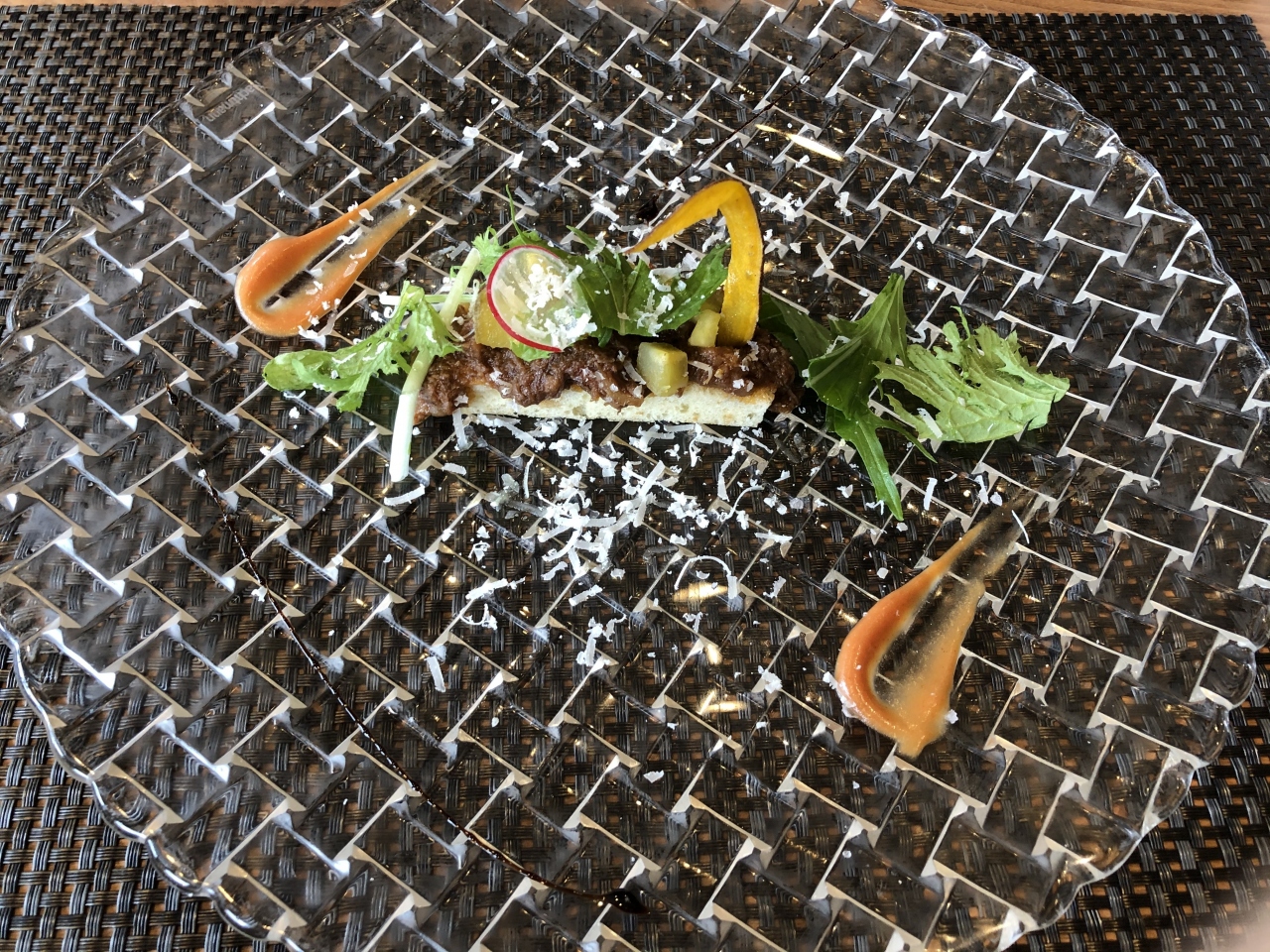 フレンチを手軽に気軽に食べられるというお店のコンセプトのようで、器やお味はかなりのクオリティですが、店全体の雰囲気はビストロのような感じ。日曜の遅い時間帯のランチでしたが、満員でした。カウンターの席で、スタッフさんが通るたびにイスの背にぶつかったり、お客さんも大声でしゃべる人がいたりと、ちょっとバタバタとした感じはしましたが、リーズナブルな値段でフレンチのフルコースがいただけます。
