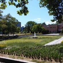 草花と中央の噴水がシンボル