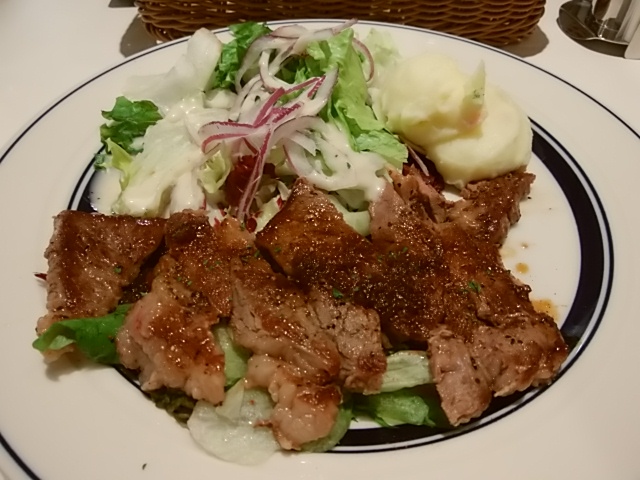 東京駅構内、グランスタのザビートダイナー。店頭の看板のステーキにつられてはいってみました。「アンガスビーフステーキ」1210円(10%税込)を注文です。